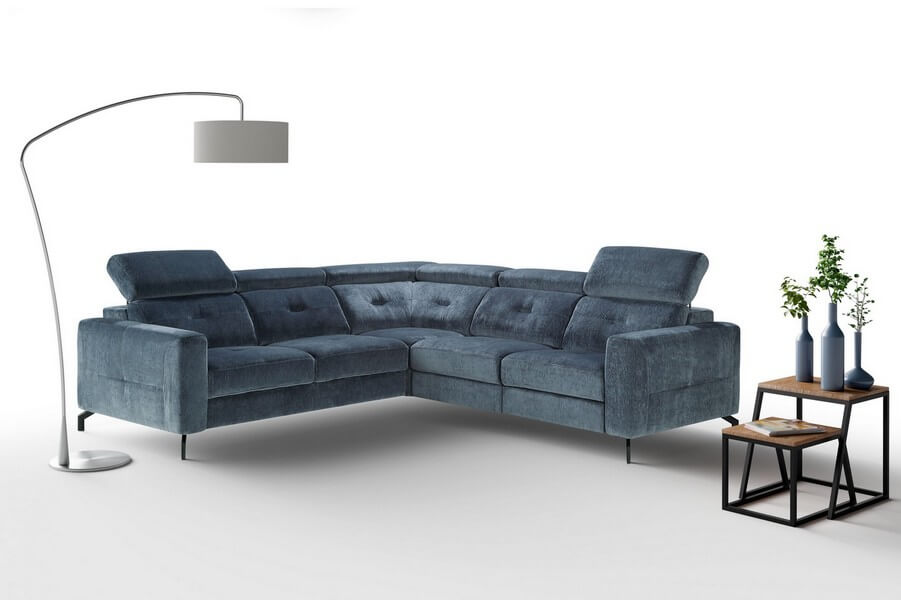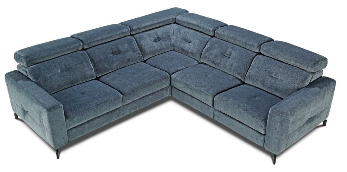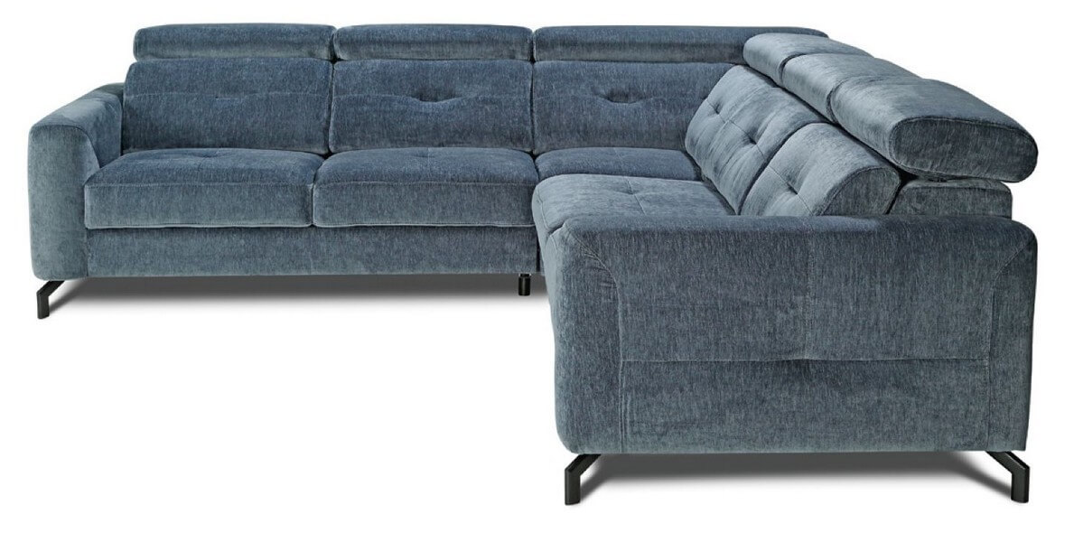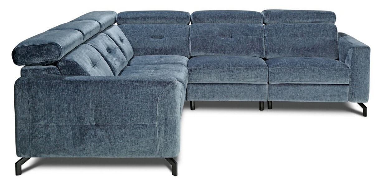 Narożnik z funkcją spania 190x115cm, pojemnikiem na pościel, wyposażony w funkcję relaks płynnie sterowany elektrycznymi sensorami, wygodne regulowane zagłówki, podłokietniki, solidna metalowa czarna noga (dostępne również kolory: chromowany lub miedziany).