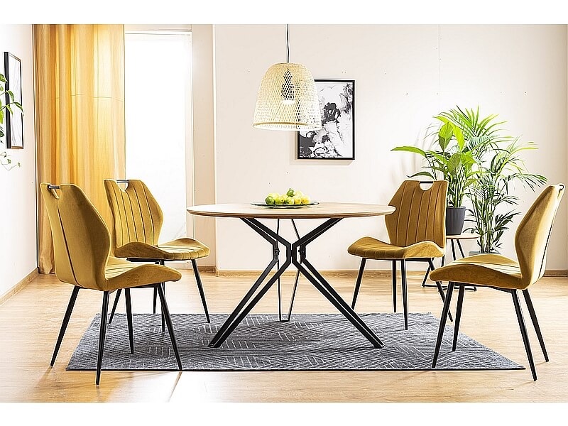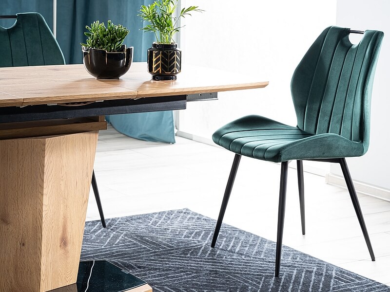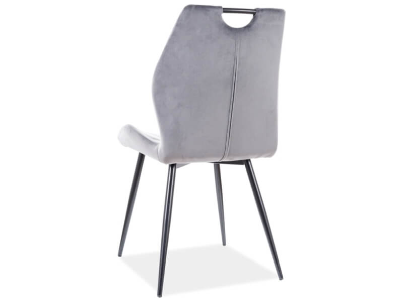 Oryginalne i eleganckie krzesło w nowoczesnym stylu, z wygodnym profilowanym siedziskiem i oparciem. Tapicerowany wysokiej jakości tkaniną aksamit Bluvel. Krzesło osadzone jest na solidnych, metalowych nogach w kolorze czarny mat. Krzesło wyposażone jest w poręczną metalową rączką, która ułatwi przenoszenie krzesła.