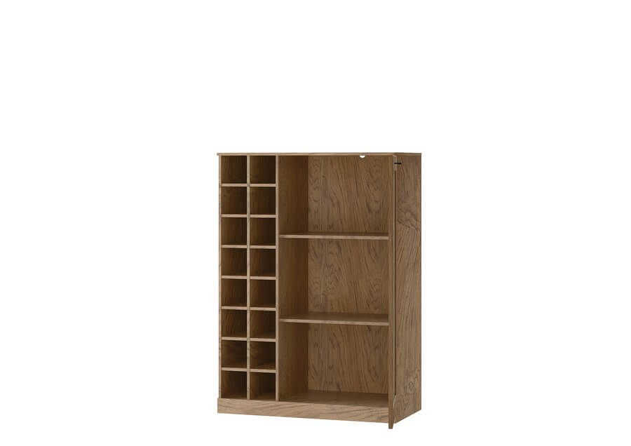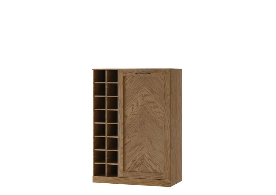 Barek wykonany w kolorystyce naturalnego drewna dębowego wprowadzi do naszych pomieszczeń niepowtarzalny urok. W barku w części ukrytej za drzwiami znajdziesz dużo miejsca do przechowywania natomiast w części odkrytej, półeczki na butelki wina lub innego trunku.