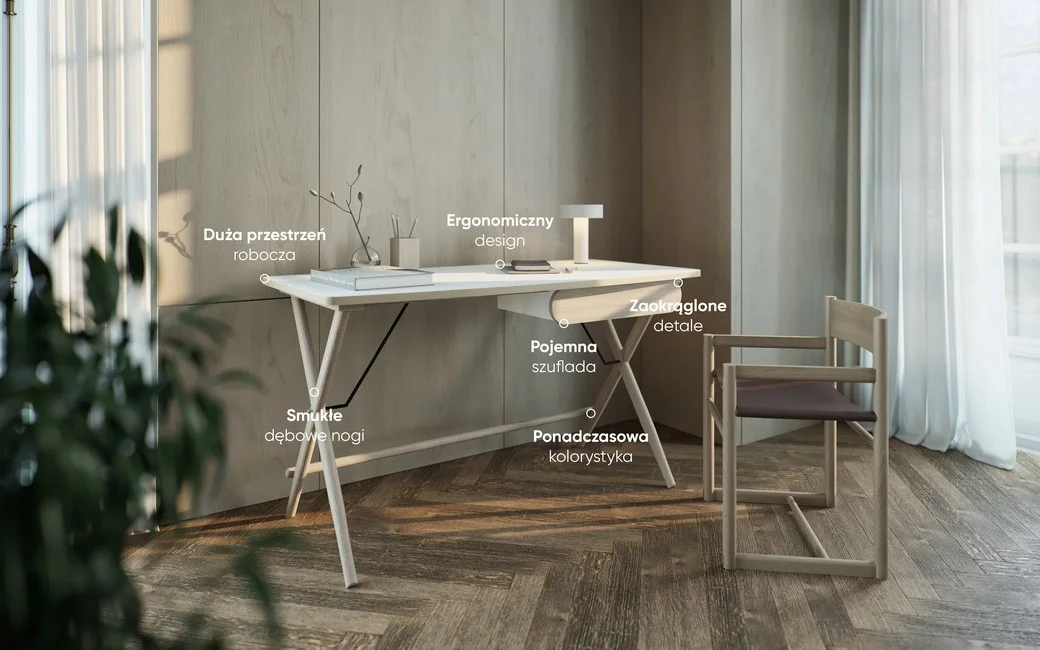 Biurko wyposażone jest w przestronną szufladę, umożliwiającą wygodne przechowywanie niezbędnych akcesoriów, co pomaga w utrzymaniu porządku w miejscu pracy.