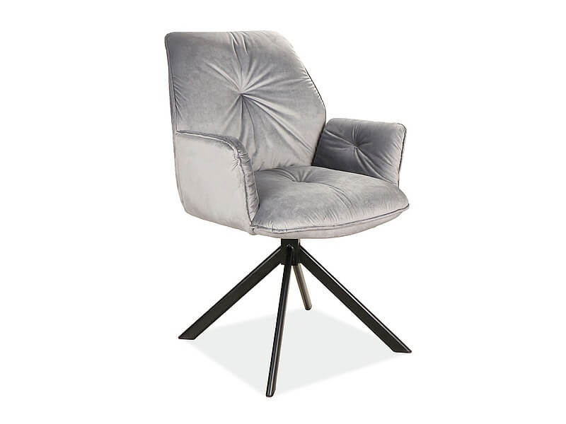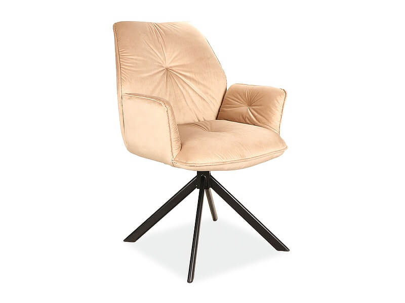 Tapicerowany wysokiej jakości tkaniną aksamit Bluvel. Krzesło osadzone jest na solidnych, metalowych nogach w kolorze czarny mat. Siedzisko obracane w zakresie 180 stopni, z funkcją powrotu do pierwotnej pozycji.