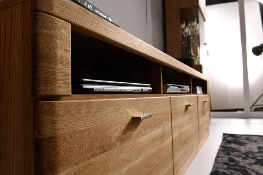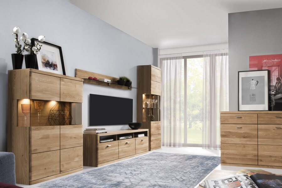 Meble z kolekcji Boston przeznaczone są do każdego typu wnętrza, zbudowane są z elementów fornirowanych na zewnątrz, naturalnych i unikatowych frontów z dębu masywnego, w których zastosowano barwione szkło hartowane.