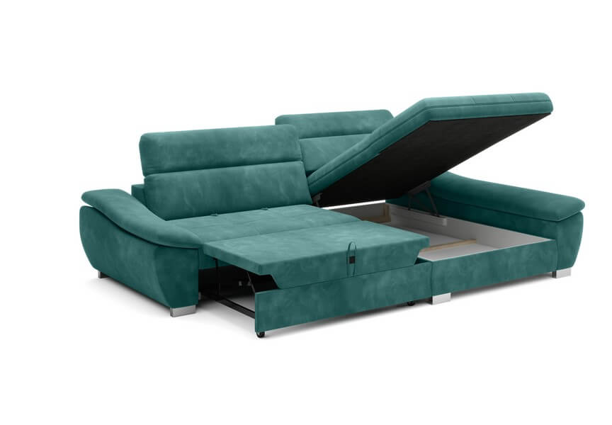 Dodatkowo narożnik wyposażony został w regulowane zagłówki oraz regulowaną głębokość siedzenia. Wygodne siedzenie zapewnia system sprężyn falistych. Narożnik dostępny jest w wersji lewo i prawostronnej.