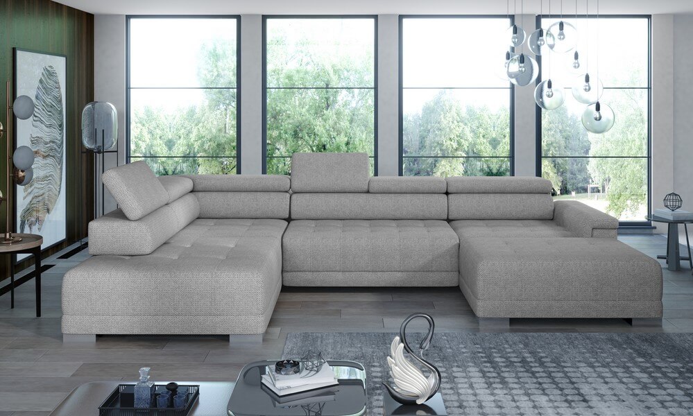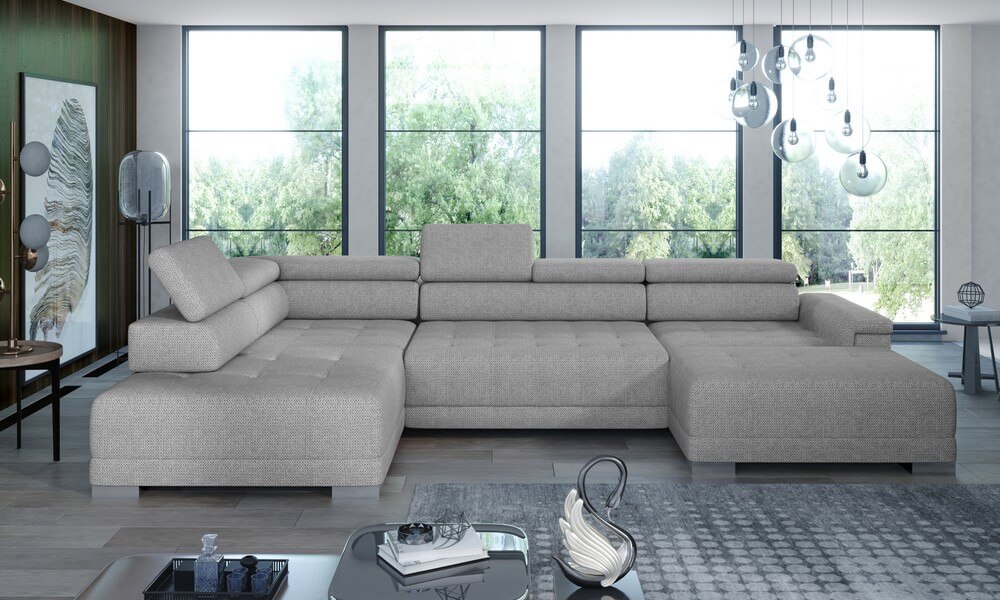 Komfortowy i nowoczesny narożnik Campo XL z elektryczną regulacją siedziska, wysuwanym oparciem i regulacją zagłówków, które stanowią dodatkowe wsparcie dla głowy. Wygodne siedzenie zapewnia system sprężyn falistych.