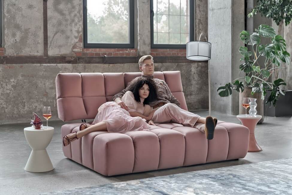 Komfortowa kolekcja mebli tapicerowanych CHOCO, posiada regulację głębokości siedziska – wystarczy przesunąć oparcie. Po cofnięciu oparcia uzyskujemy głębokość bliską szezlongowi.