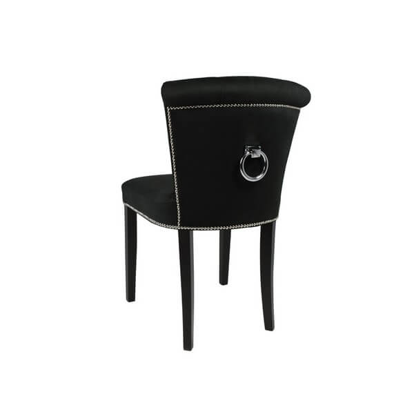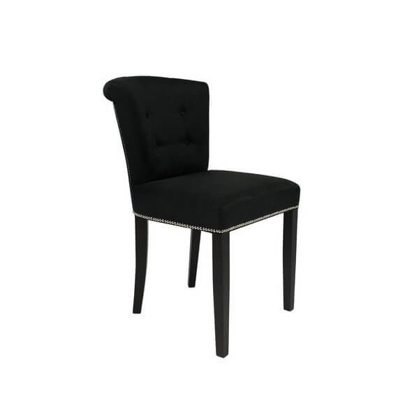 Ponadczasowe i stylowe krzesło tapicerowane Corello I. Krzesło udekorowane ozdobną kołatką i pinezkami. Krzesło dostępne w bogatej palecie barw i tkanin do wyboru. Nogi wykonane z litego drewna.