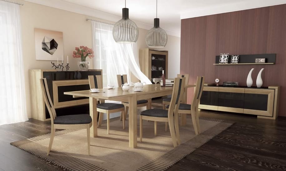 Kolekcja Corino przeznaczona do salonu i jadalni, to połączenie prostoty, funkcjonalności i naturalnego piękna. Meble modułowe występują w dwóch wybarwieniach: dąb naturalny i czarny oraz orzech i czarny.