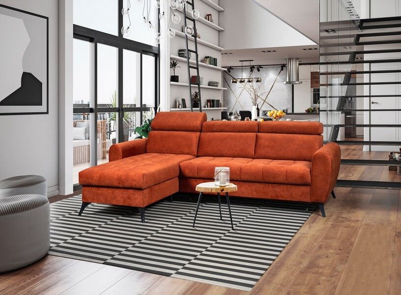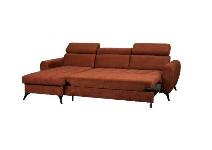 Dante to komfortowy i elegancki narożnik z funkcją spania i praktycznym pojemnikiem na pościel. Narożnik posiada funkcję wspomagania rozkładania. Komfort wypoczynku i ergonomiczne podparcie zapewniają regulowane zagłówki.