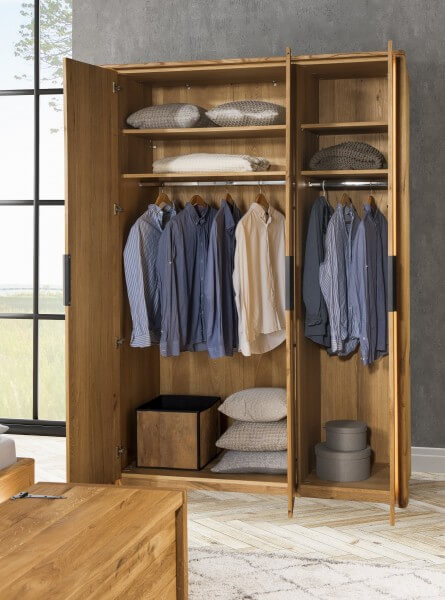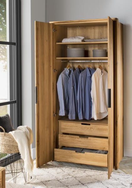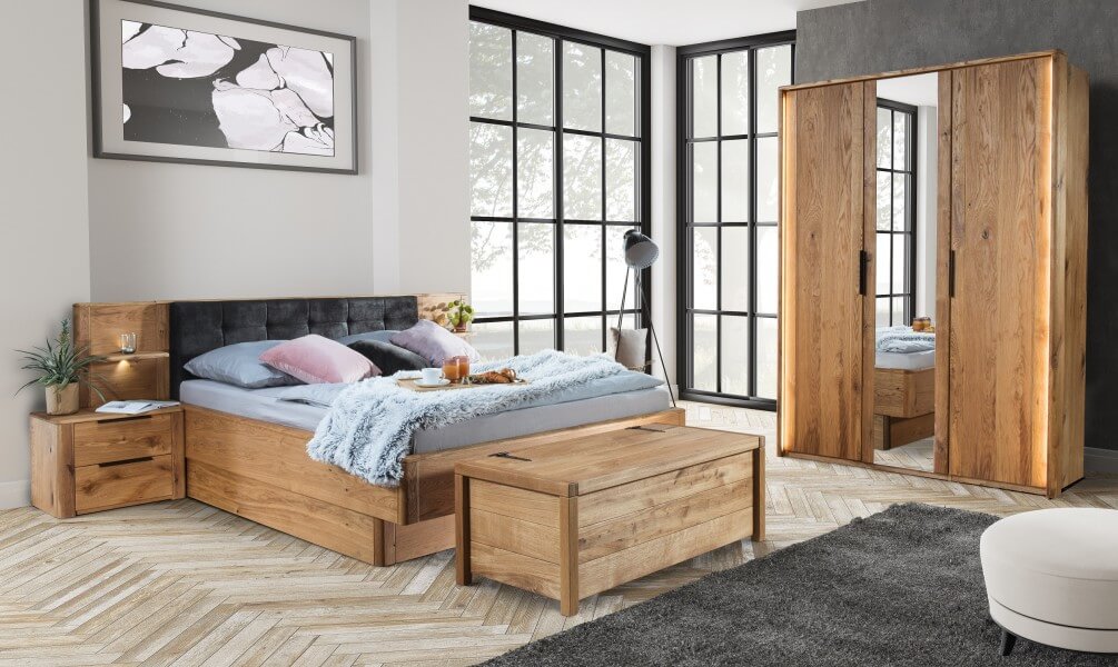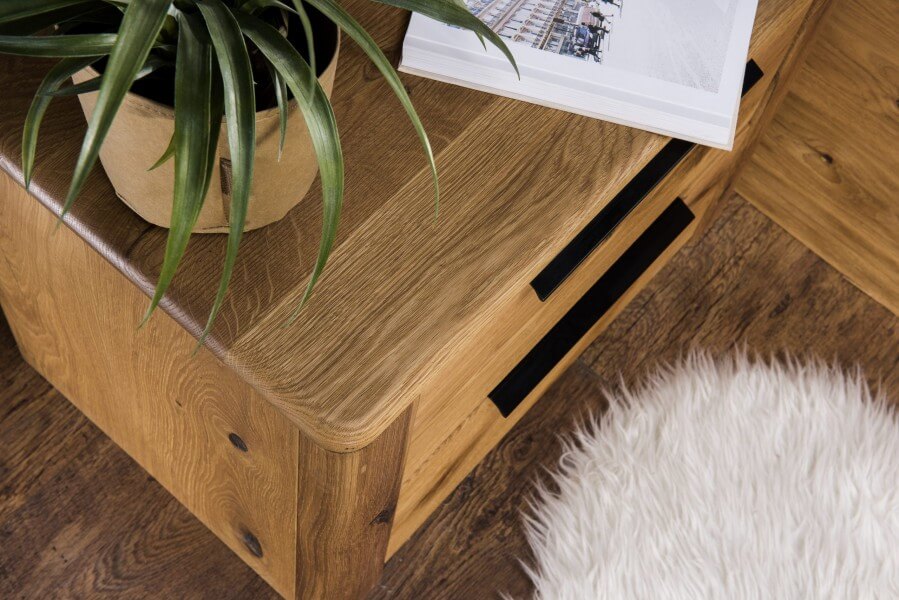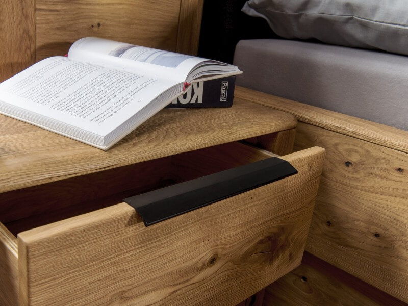 Meble do sypialni DENVER zachwycą nowoczesnym wzornictwem z zastosowaniem litego drewna dębowego i naturalnych materiałów. Miękkie szczotkowane powierzchnie podkreślają wyrazistość litego drewna.
