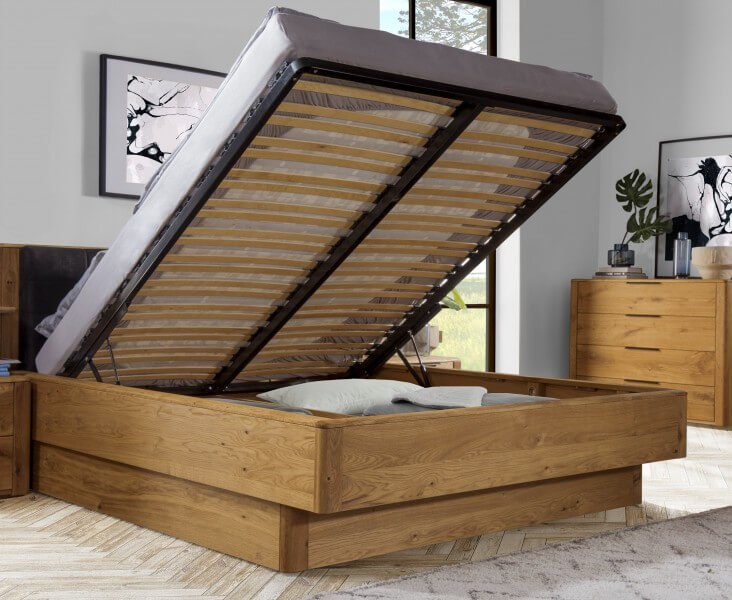 Wygodne łóżko wyposażone w dodatkową przestrzeń do przechowywania pod łóżkiem.