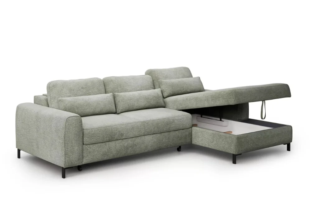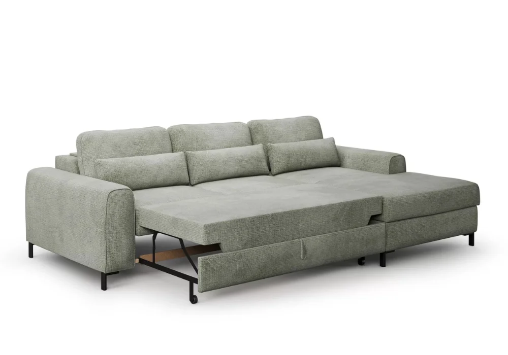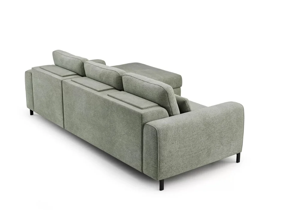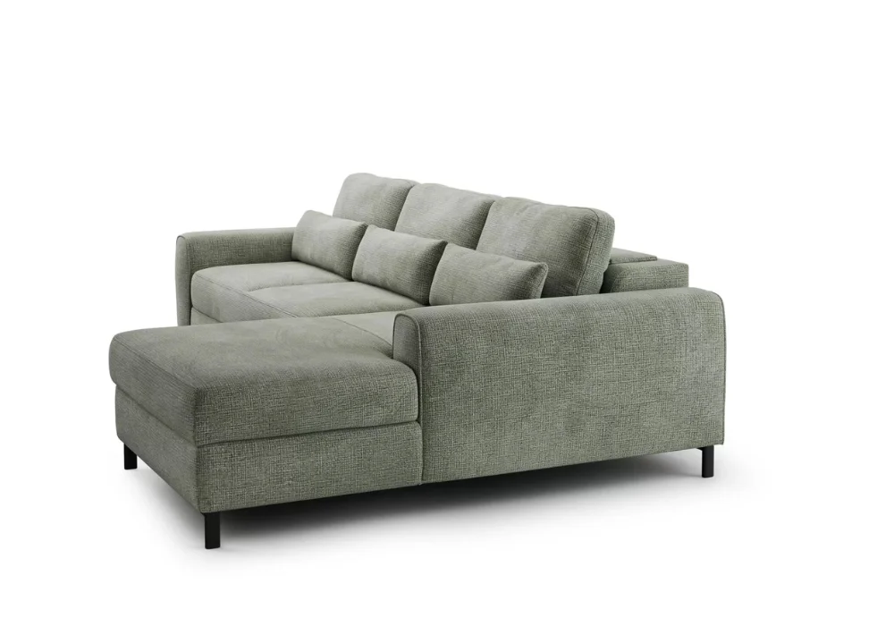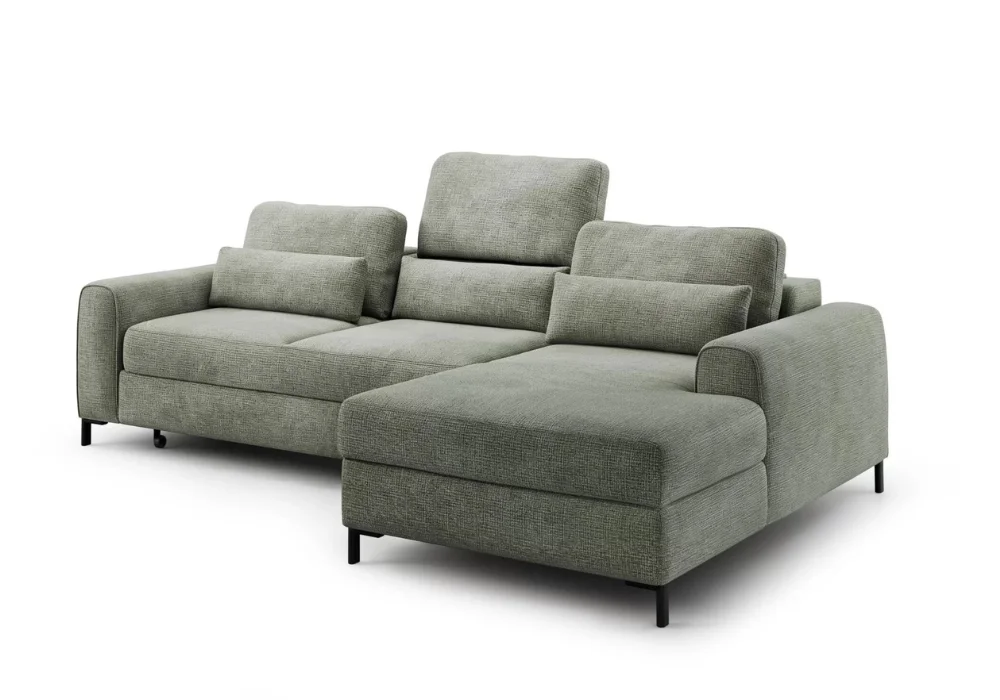 Model wyposażono w funkcję spania typu DL, dzięki której narożnik w prosty sposób zamienia się w komfortowe miejsce do nocnego odpoczynku. To praktyczne rozwiązanie szczególnie docenią osoby, które potrzebują dodatkowej powierzchni do spania bez rezygnowania z estetyki salonu. Możliwość wyboru koloru oraz rodzaju tkaniny lub skóry pozwala dopasować narożnik do własnych potrzeb i stylu wnętrza.