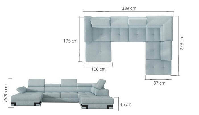szer. 339 cm, gł. 175/223 cm, wys. 75-95 cm, pow. spania 122×270 cm, pojemnik na pościel: 16x87x112 cm, wys. siedziska 45 cm.