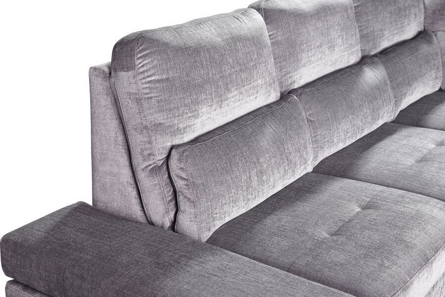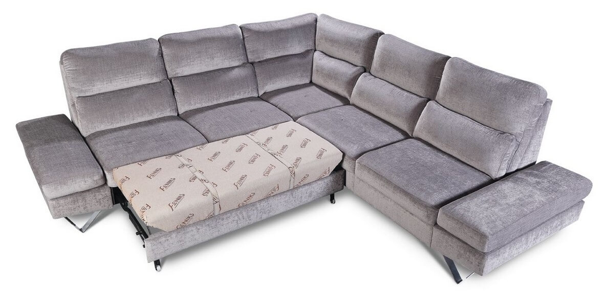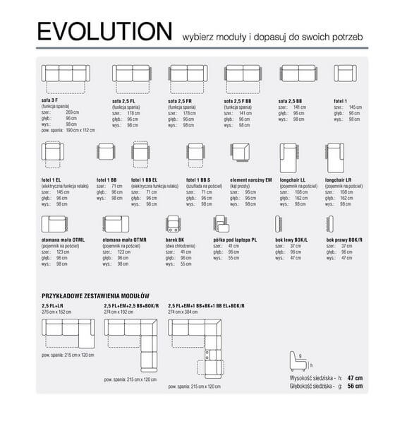 Narożnik modułowy Evolution posiada funkcje spania typu delfin o powierzchni 215 cm x 120 cm, regulowane podłokietniki pozwalające wygodnie oprzeć się bokiem oraz wygodne oparcie.