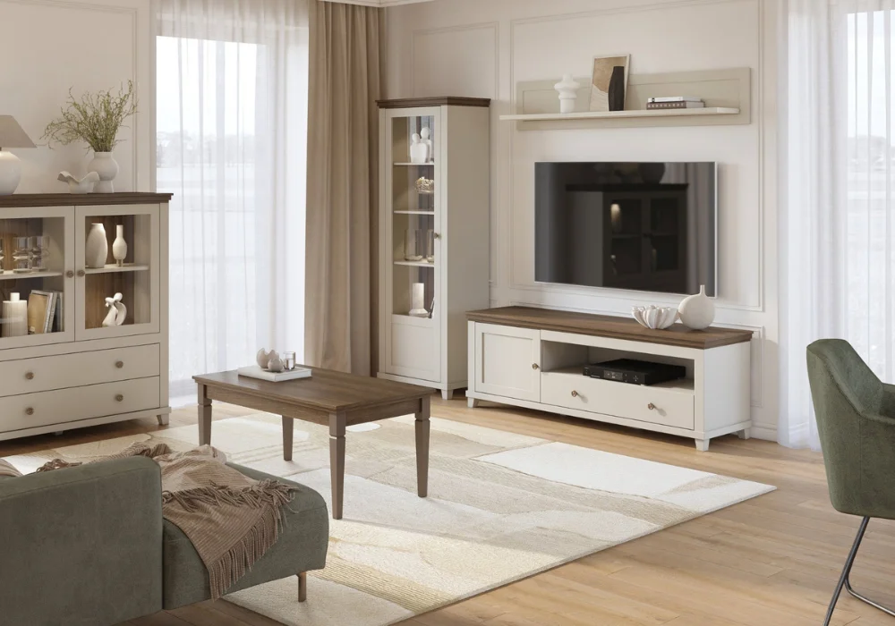 Kolekcja Evora to połączenie ciemnego koloru z jasnym drewnem, doskonale sprawdzi się w pokoju dziennym, w salonie oraz w jadalni.