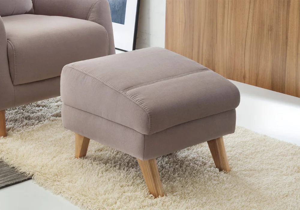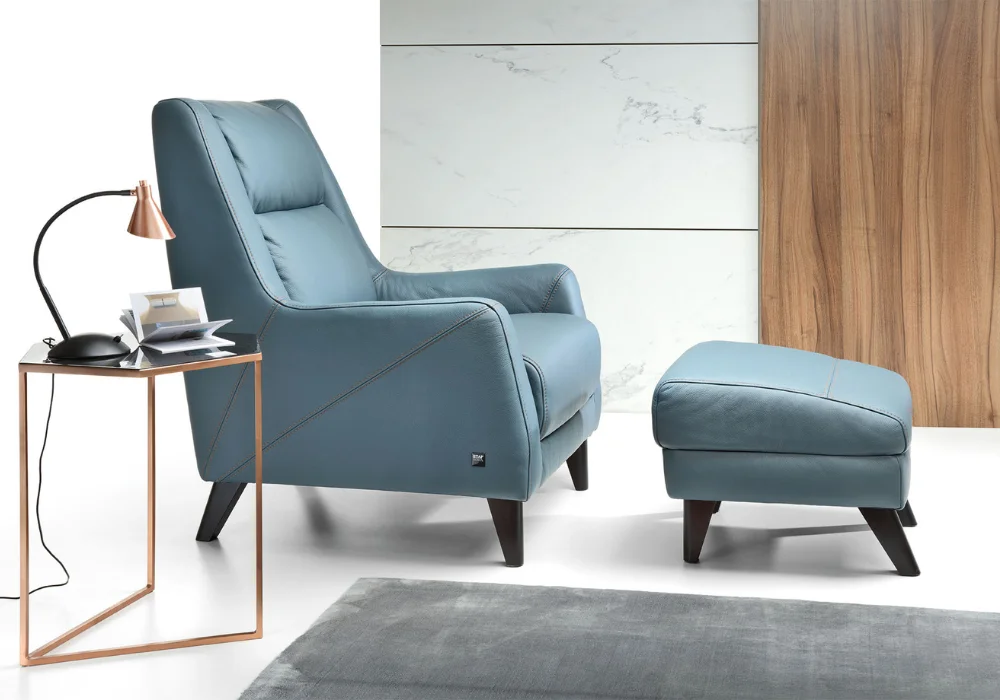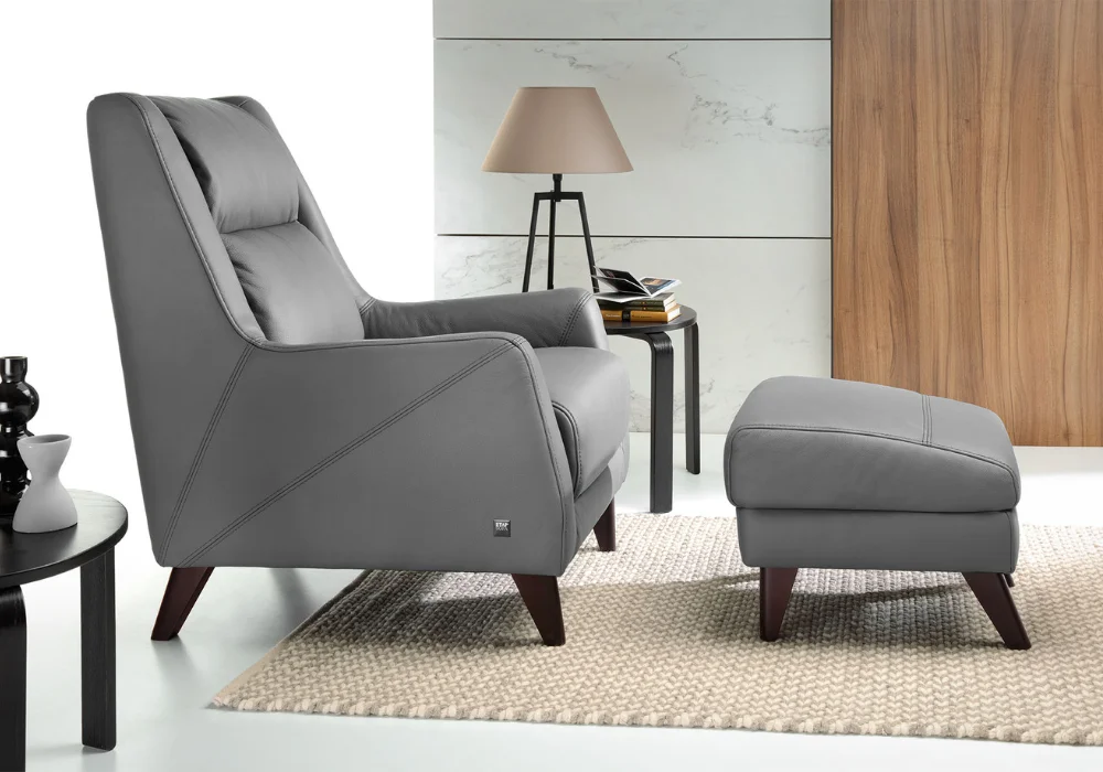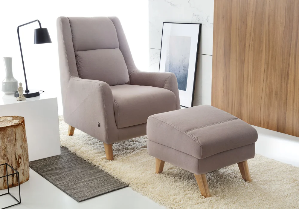 Fotel dostępny jest w szerokim wachlarzu tkanin oraz skór naturalnych. Nóżki drewniane dostępne w wielu wybarwieniach. Dla podniesienia komfortu wypoczynku można dostawić podnóżek.