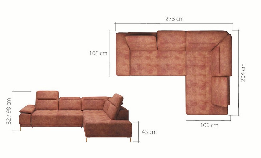 Komfort użytkowania dopełnia system sprężyn falistych. Narożnik dostępny jest w wersji lewostronnej lub prawostronnej. Wypoczynek tapicerowany skórą naturalną lub wysokiej jakości tkaniną obiciową.