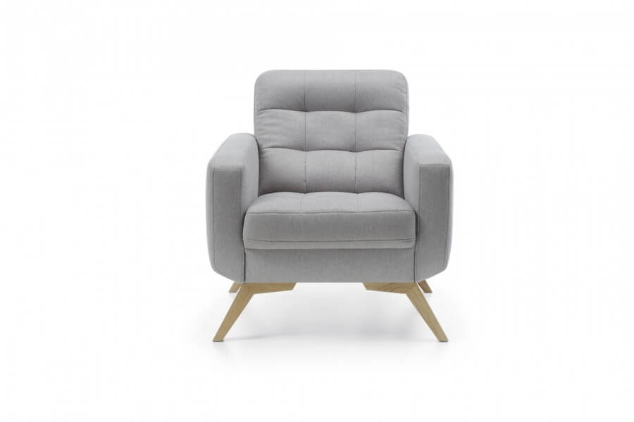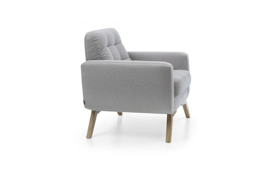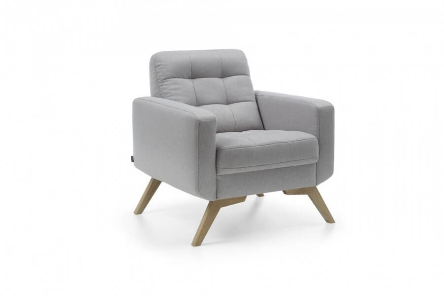 Wygodny fotel na ciekawie zaprojektowanych drewnianych nóżkach, z geometrycznymi pikowaniami na oparciu i siedzisku. Pasuje do sofy Fiord.