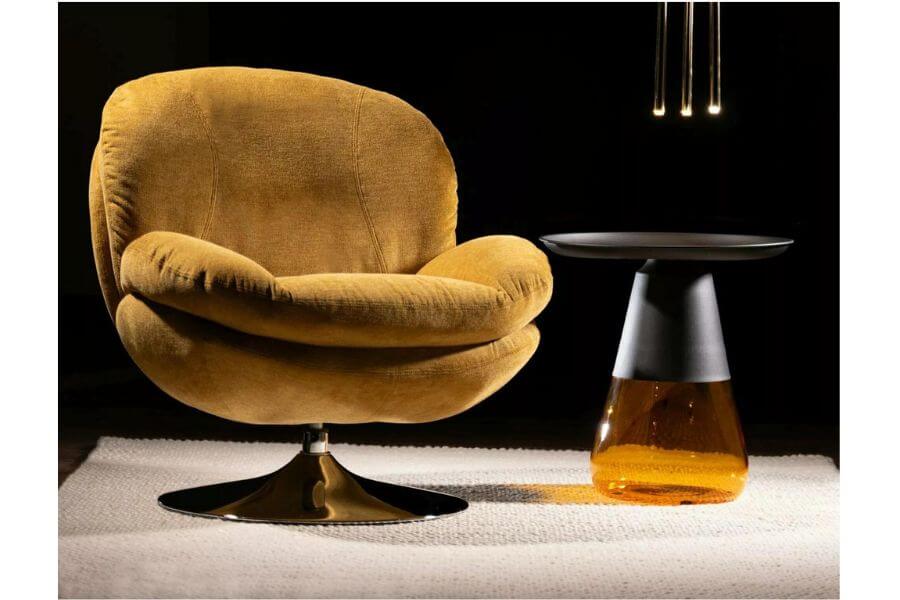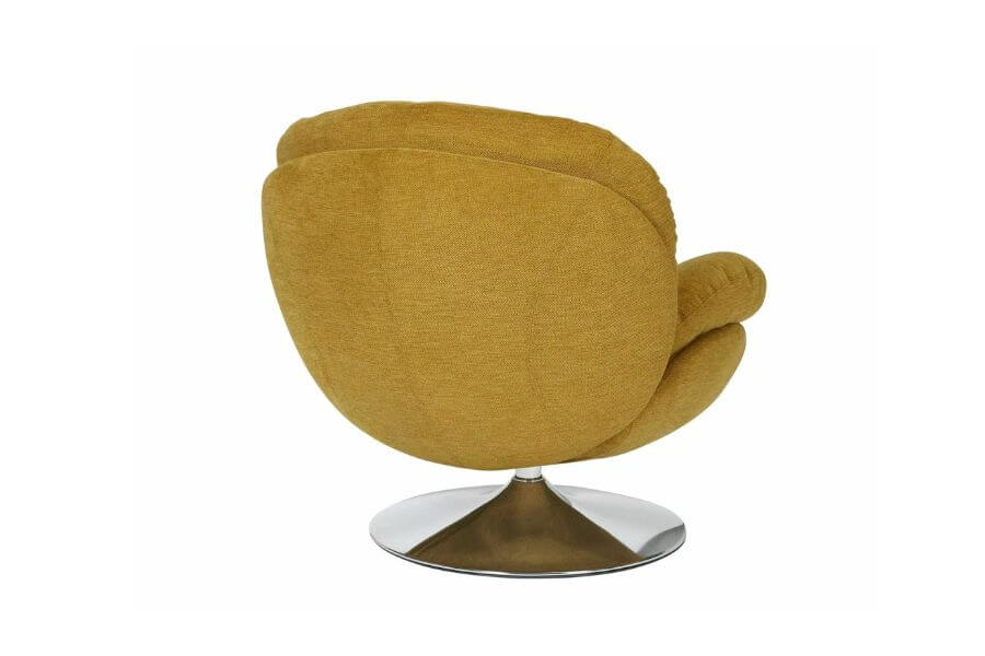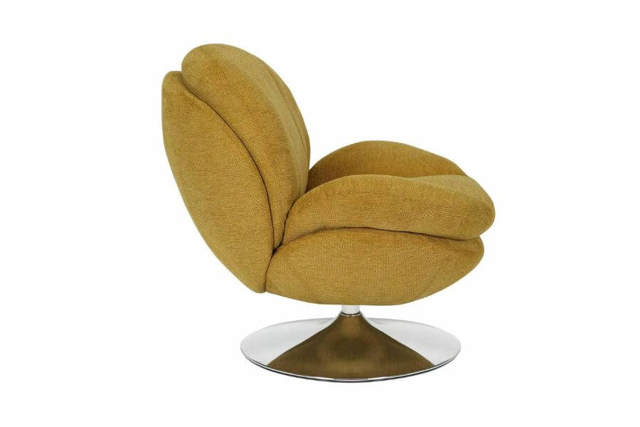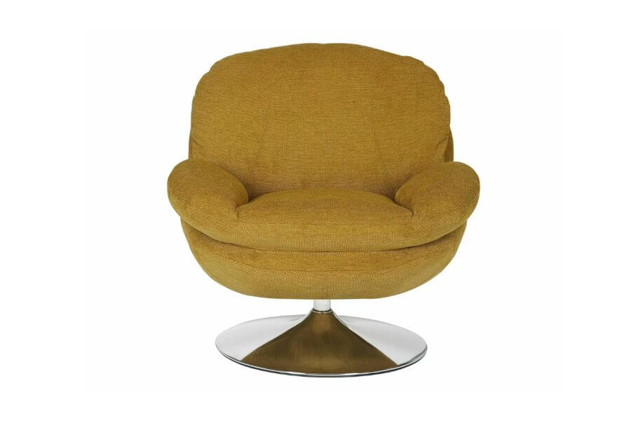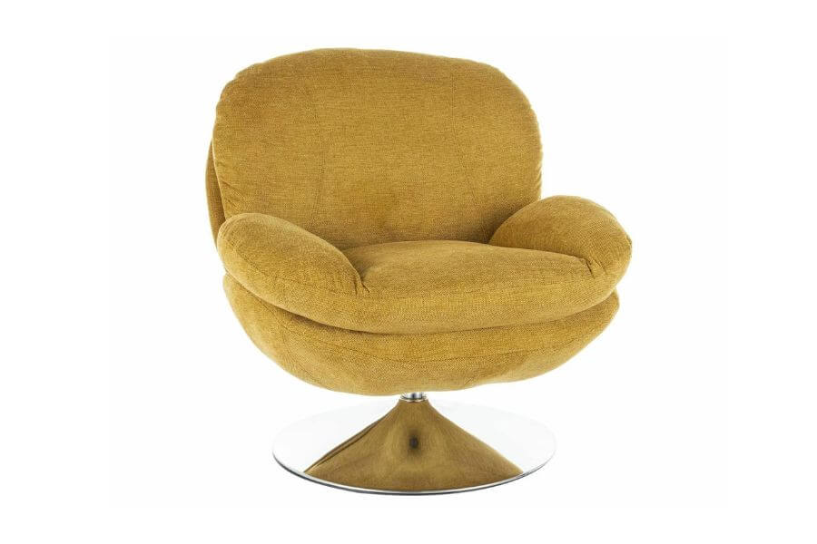 Podstawa fotela, wykonana z chromowanej stali, gwarantuje stabilność i estetyczny wygląd. Dzięki funkcji obrotu o 360 stopni, fotel Brigitte Brego jest nie tylko elegancki, ale i niezwykle praktyczny. Stelaż z metalu w kolorze curry i chromu dodaje mu nowoczesnego wyglądu, czyniąc go idealnym dodatkiem do każdego wnętrza.