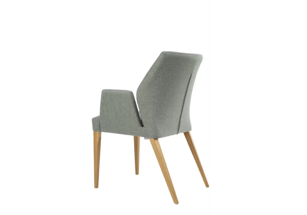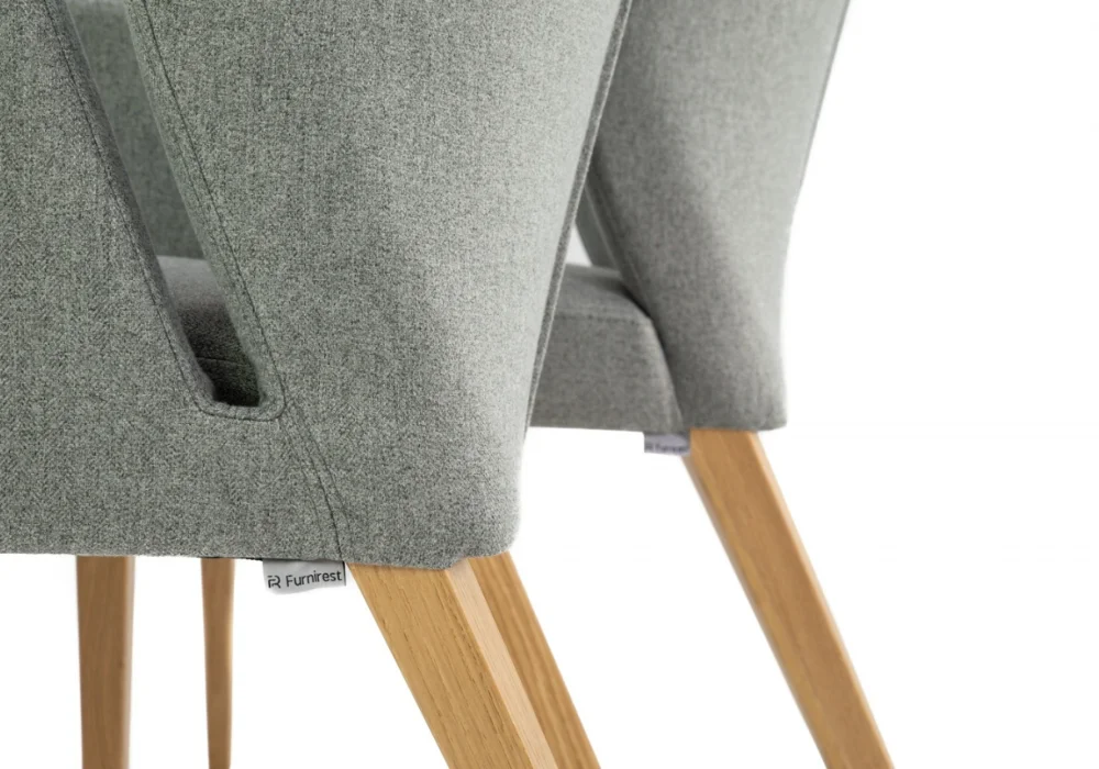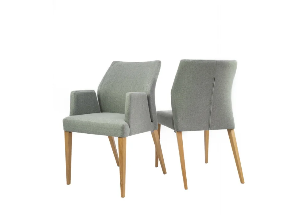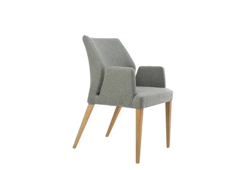 Komfortowy fotel z podłokietnikami o modnej stylistyce, drewnianym korpusem, tapicerowanym siedziskiem i oparciem. Fotel dostępny w bogatej palecie barw i tkanin do wyboru.