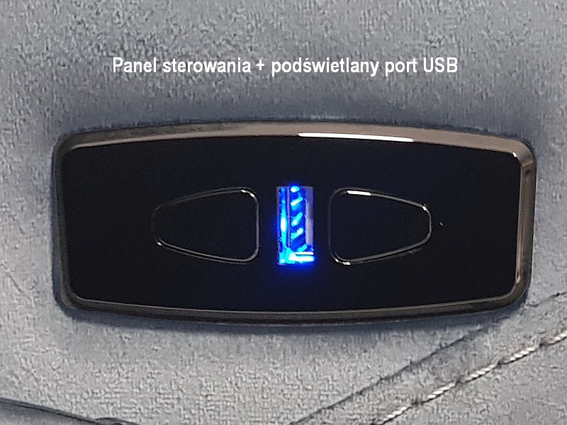 Rozkładanie fotela jest proste – wystarczy użyć panelu sterowania lub pilota. Panel wyposażony dodatkowo w podświetlany port USB.