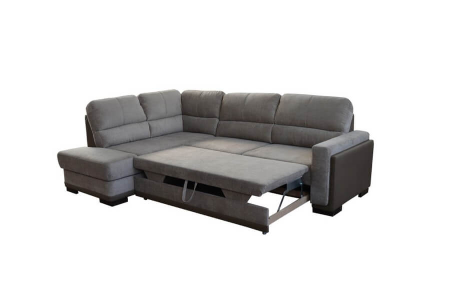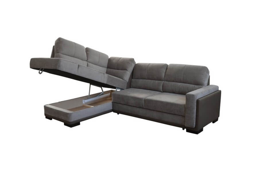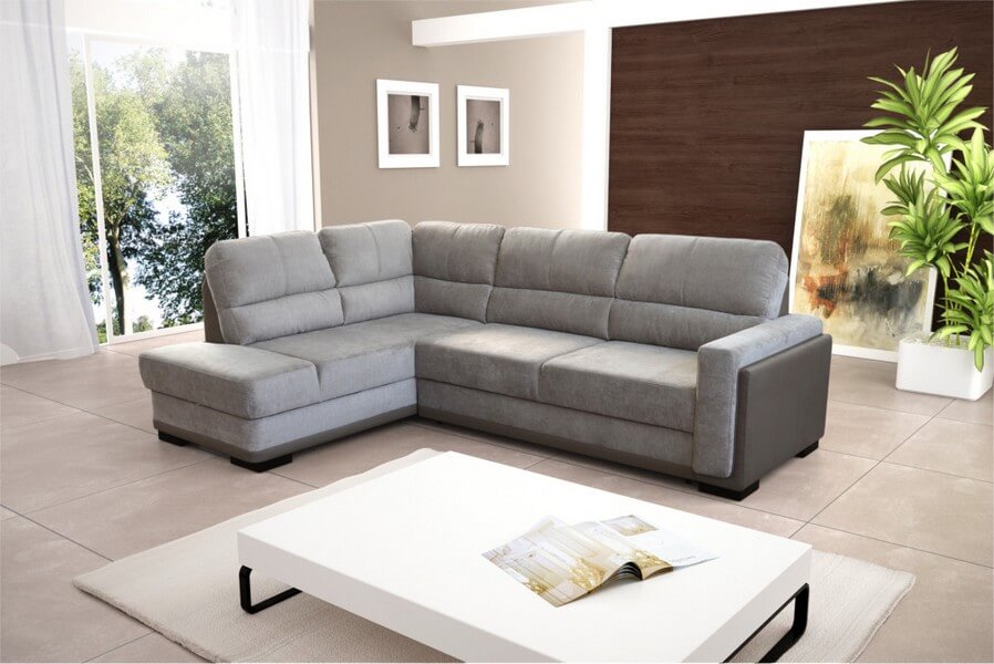 Narożnik Giallo wpisuje się w aktualnie panujące trendy. Wyposażony w funkcję spania i pojemnik na pościel.