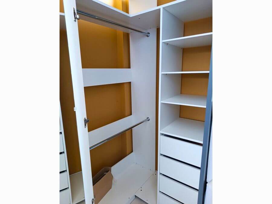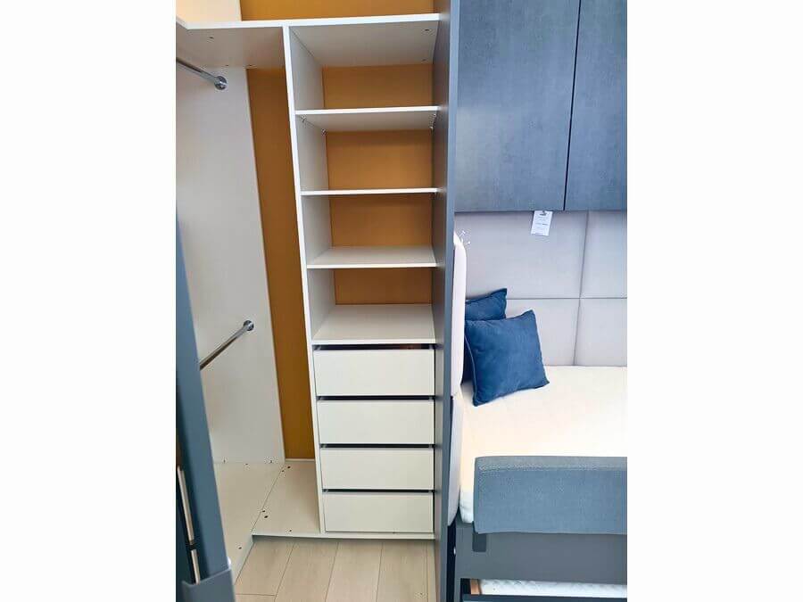 We wnętrzu układ z słupkiem zawierającym 4 szuflady i 4 półki, dwa drążki na wieszaki oraz wysoką narożną półkę. Elementy wewnętrzne z białej, laminowanej płyty. Drzwi otwierane na lewą stronę, z zamontowanym lustrem na wewnętrznej stronie frontu. Półki zamocowane na specjalnych podpórkach, które zabezpieczają przed ich wysunięciem. Szuflady wyposażone w system spowalnianego zamykania, co zapewnia ciche i płynne działanie. Oświetlenie – ledowa lampka z czujnikiem ruchu, mocowana na magnes, która oświetla wnętrze garderoby. Konstrukcja ścian zapewnia odpowiednią wentylację przy zamkniętych drzwiach.