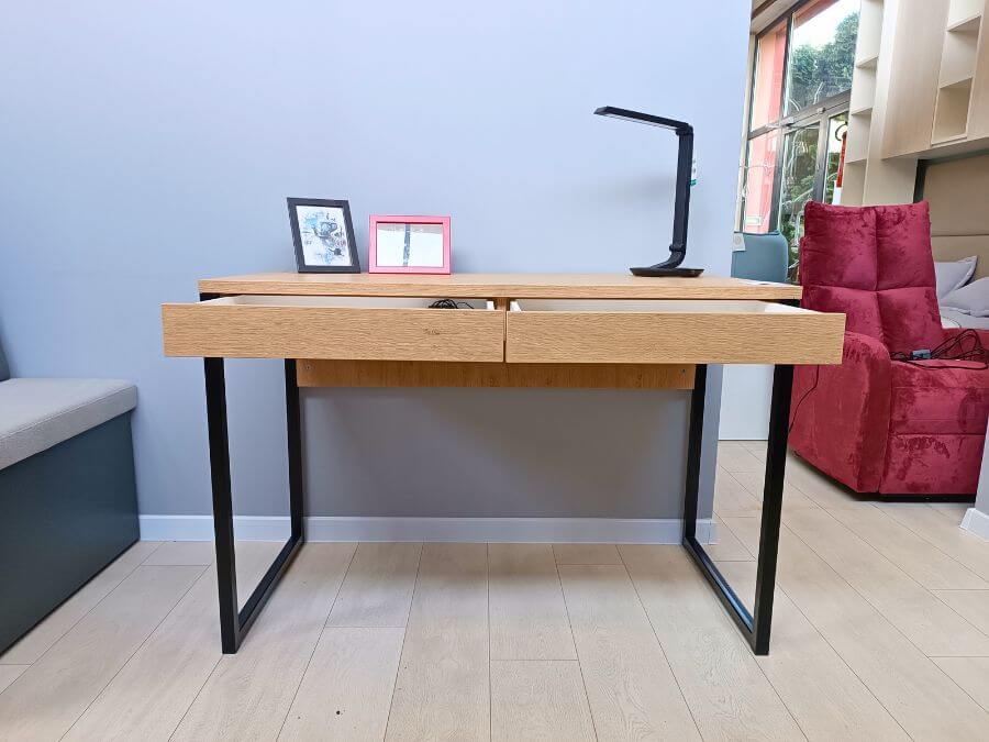 Dwie szuflady zamontowane pod blatem, oferują dodatkową przestrzeń do przechowywania. Delikatnie wydłużone fronty szuflad umożliwiają wygodne otwieranie, a system spowalnianego zamykania zapewnia ciche i płynne działanie. Przestrzeń kolanowa z wysokością 68,5 cm, zapewnia większą swobodę i komfort podczas pracy. Tylna ściana zasłaniająca kolana, umożliwia elastyczne aranżowanie przestrzeni, pozwalając na ustawienie biurka zarówno przy ścianie, jak i w dowolnym miejscu pokoju lub biura.