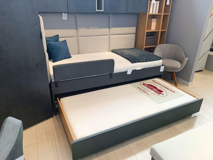 Dolne spanie wysuwa się na gumowych kółkach, które nie rysują podłogi, natomiast górne łóżko wyposażone jest w specjalne stopery zapobiegające zbyt dalekiemu wysunięciu. Cena łóżka nie objemuje materacy. Oferujemy szeroki wybór materacy z atrakcyjnym rabatem, aby kompleksowo zadbać o Twój komfort snu.