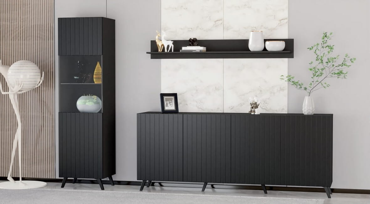 Na koniec zadecyduj czy meble staną na smukłych nowoczesnych nóżkach czy stabilnych cokołach. Wybór należy do Ciebie. Perfekcyjnie wyprofilowane metalowe nogi oraz wstawki w czarnym kolorze podkreślają oryginalną stylistykę mebli. Niezwykle dekoracyjnym elementem mebli są lamele nadające im harmonijny i spójny wygląd.