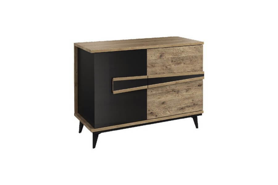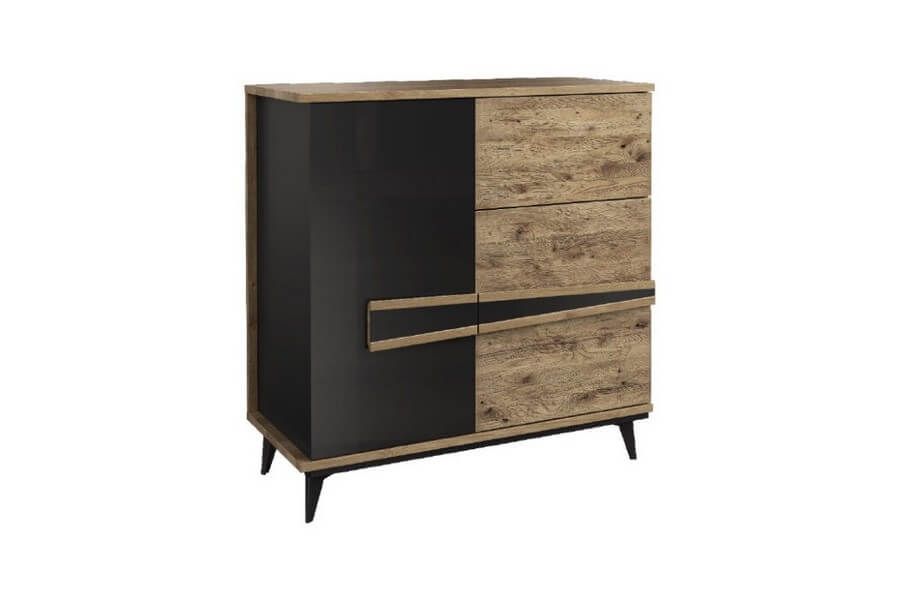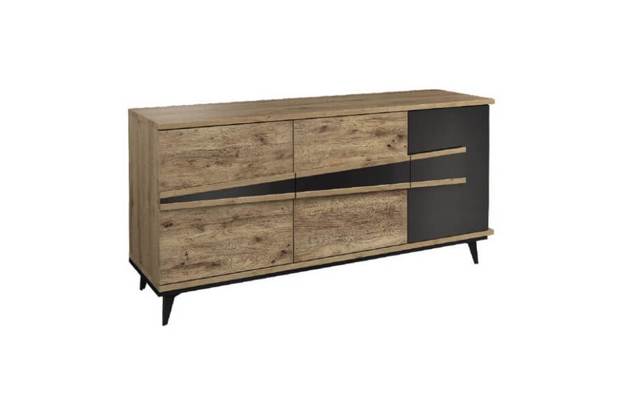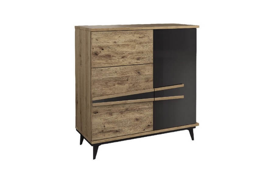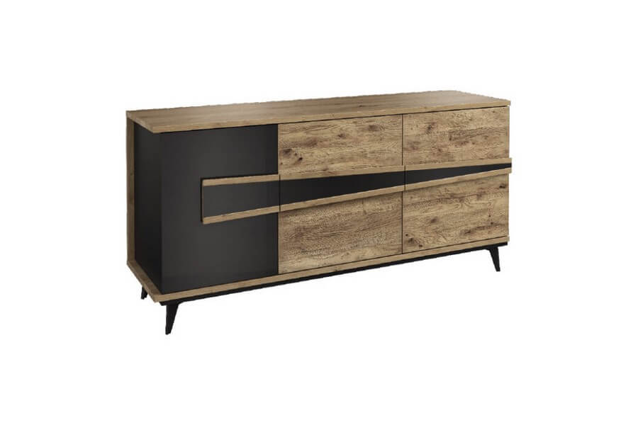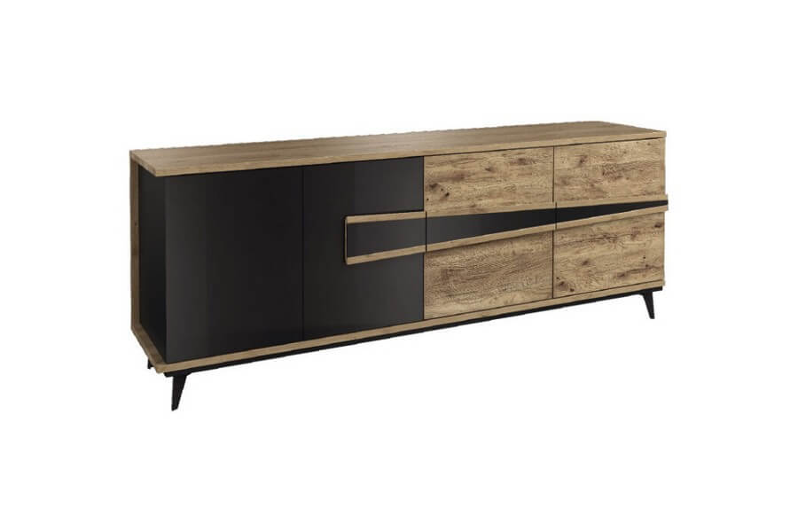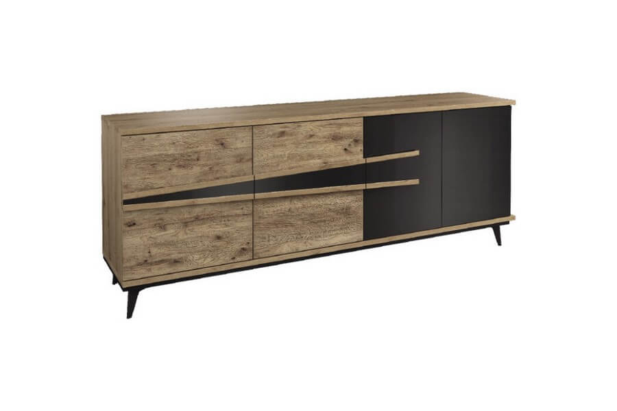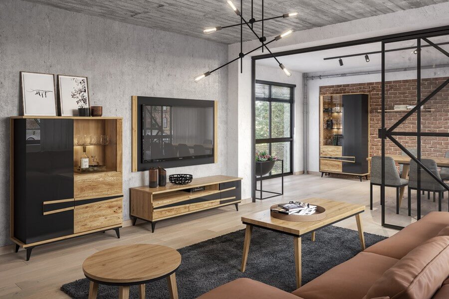 Etna to unikalna kolekcja mebli do salonu, jadalni oraz sypialni stworzona z litego drewna i naturalnej okleiny. Charakteryzuje się industrialnym stylem i niezwykłą paletą kolorystyczną, łącząc dąb naturalny lager z głęboką czernią szkła. Drewniane elementy wykonane z dębu zostały starannie strukturyzowane i zabarwione, nadając im wyjątkowy charakter. Metalowe nóżki oraz oryginalne uchwyty z czarnego szkła doskonale oddają charakter kolekcji, nadając meblom lekkości i designerskiego wyglądu.