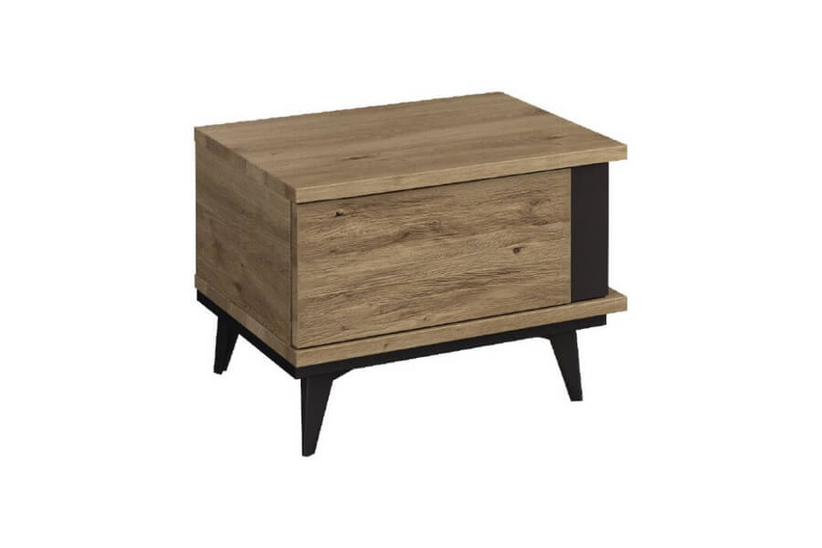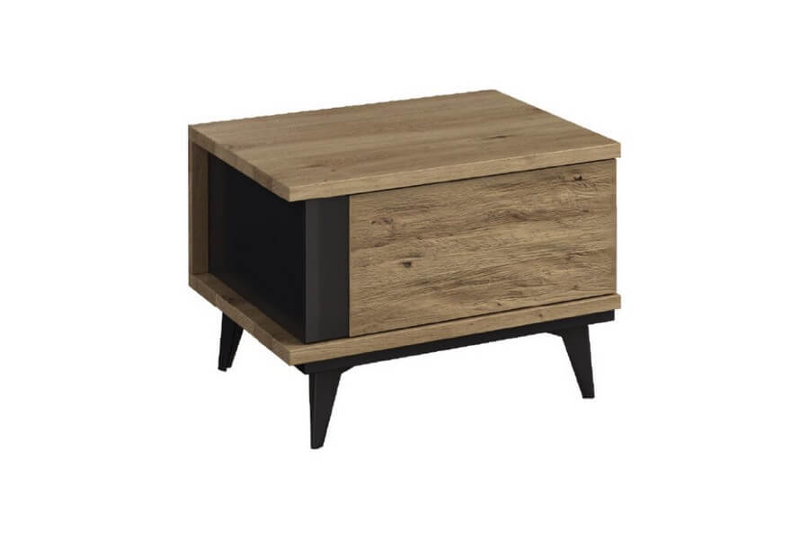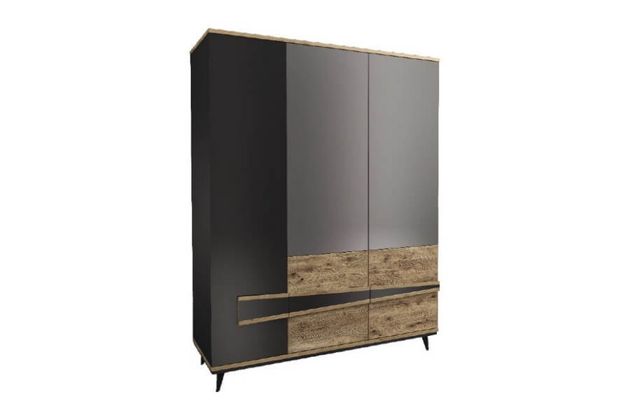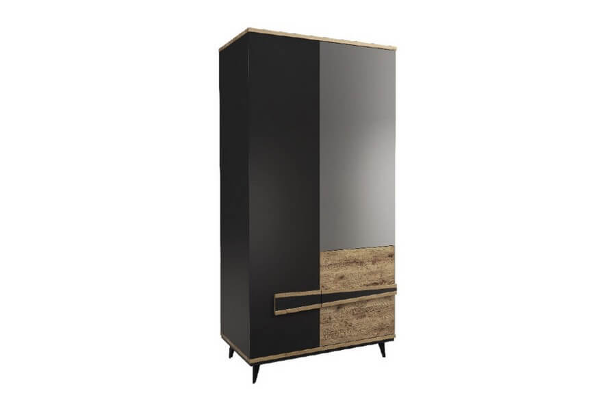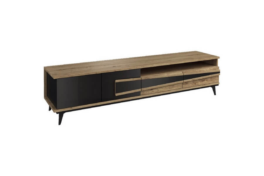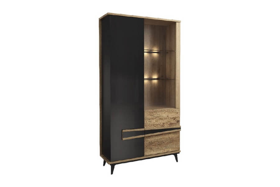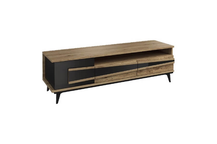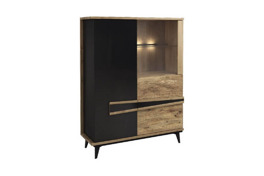 Etna to unikalna kolekcja mebli do salonu, jadalni oraz sypialni stworzona z litego drewna i naturalnej okleiny. Charakteryzuje się industrialnym stylem i niezwykłą paletą kolorystyczną, łącząc dąb naturalny lager z głęboką czernią szkła. Drewniane elementy wykonane z dębu zostały starannie strukturyzowane i zabarwione, nadając im wyjątkowy charakter. Metalowe nóżki oraz oryginalne uchwyty z czarnego szkła doskonale oddają charakter kolekcji, nadając meblom lekkości i designerskiego wyglądu.