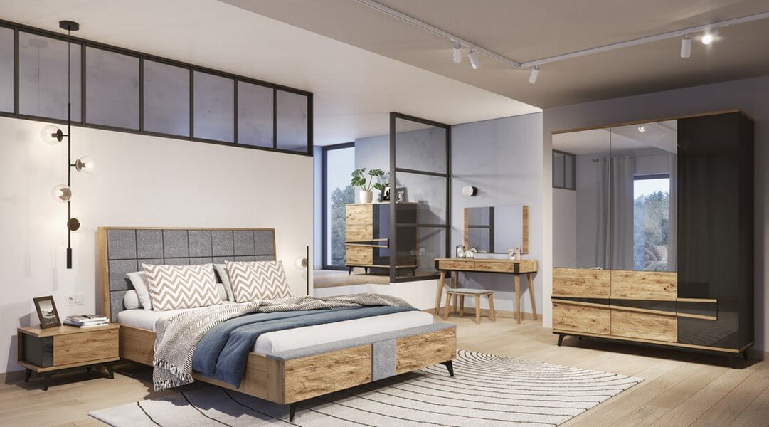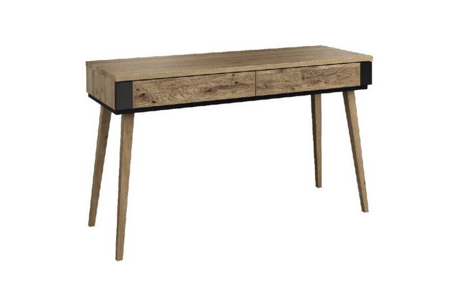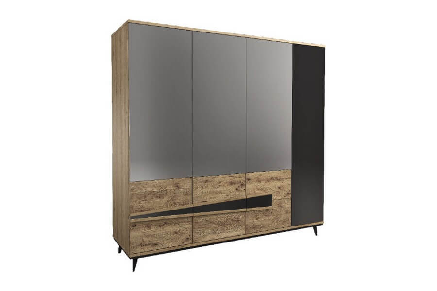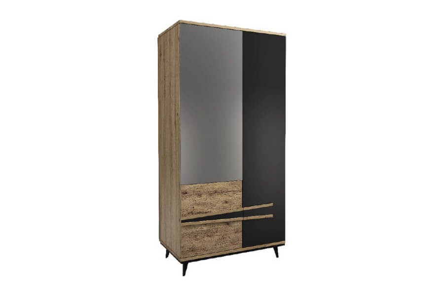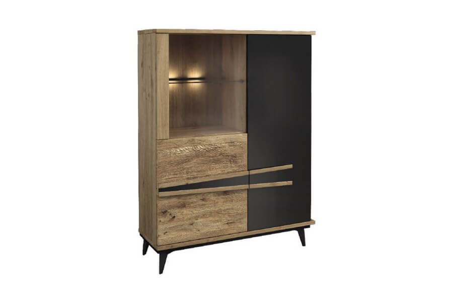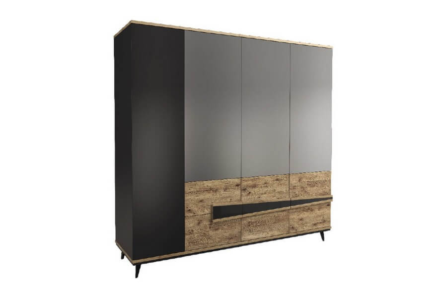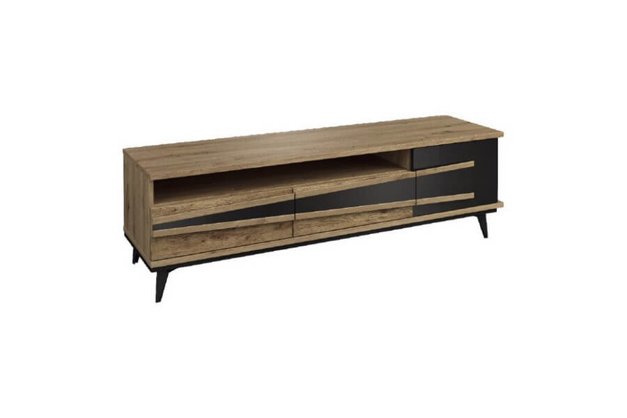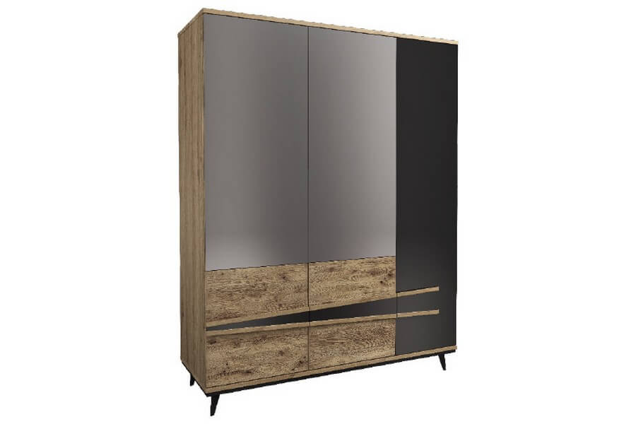 Etna to unikalna kolekcja mebli do salonu, jadalni oraz sypialni stworzona z litego drewna i naturalnej okleiny. Charakteryzuje się industrialnym stylem i niezwykłą paletą kolorystyczną, łącząc dąb naturalny lager z głęboką czernią szkła. Drewniane elementy wykonane z dębu zostały starannie strukturyzowane i zabarwione, nadając im wyjątkowy charakter. Metalowe nóżki oraz oryginalne uchwyty z czarnego szkła doskonale oddają charakter kolekcji, nadając meblom lekkości i designerskiego wyglądu.