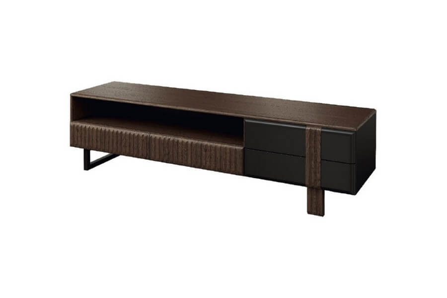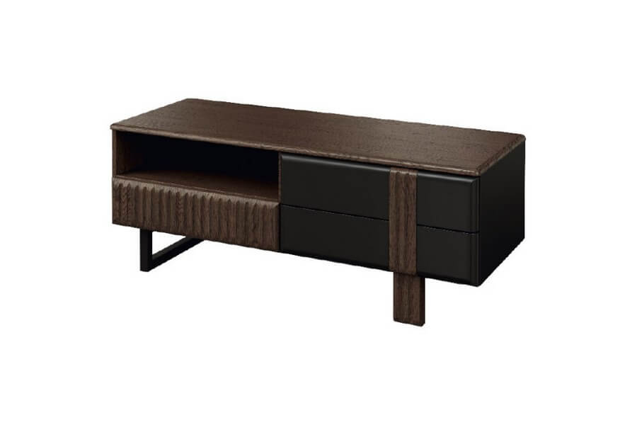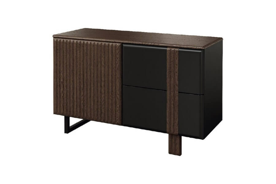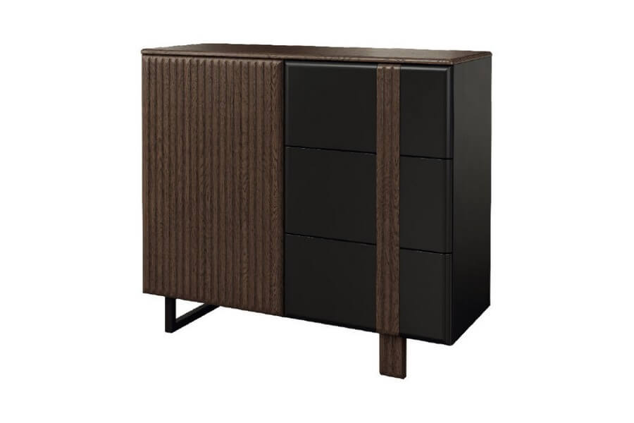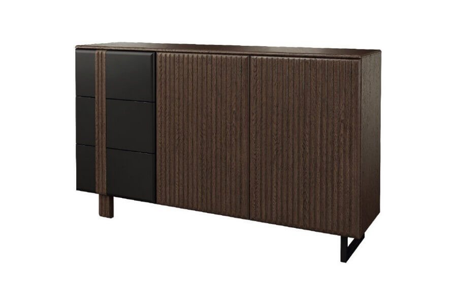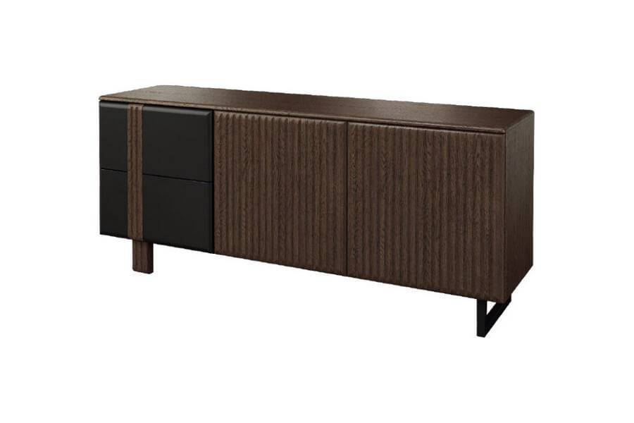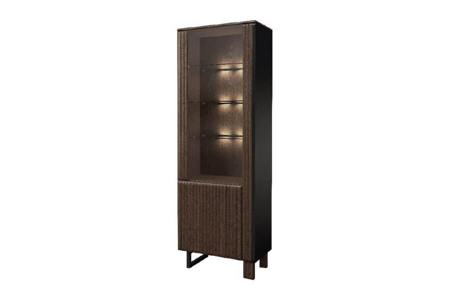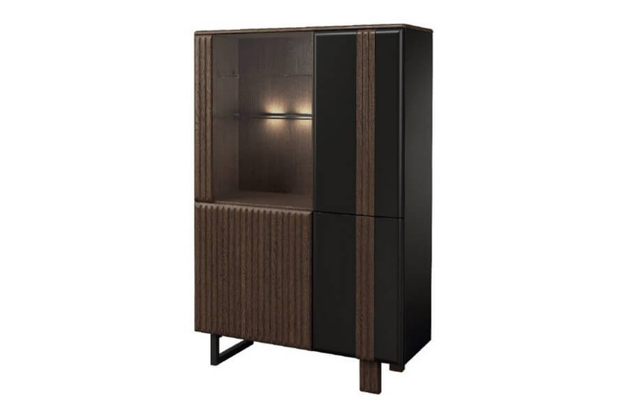 Nowoczesna, prosta forma mebli w ramach kolekcji doskonale współgra z oryginalnym wykończeniem, które obejmuje pionowe lameli zastosowane we frontach szafek, witryn oraz komód. Dopełnieniem tego wyjątkowego designu jest brązowe szkło antisol, które nadaje kolekcji wyjątkowego charakteru. Przez to przyciemnione szkło można dostrzec cenne przedmioty, które są oświetlone delikatnym ledowym światłem. Punkty świetlne zamocowane na tylnych krawędziach szklanych półek tworzą niezwykle dekoracyjny efekt i podkreślają piękno eksponowanych przedmiotów.