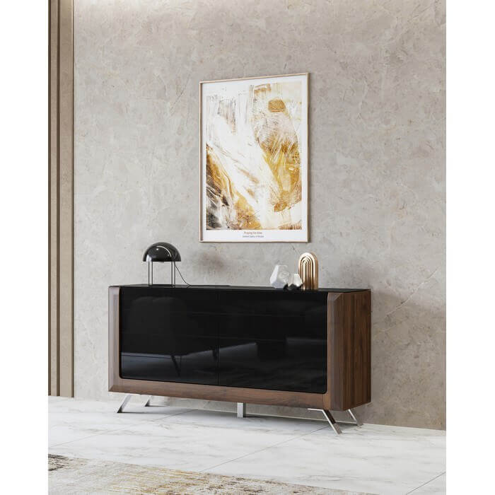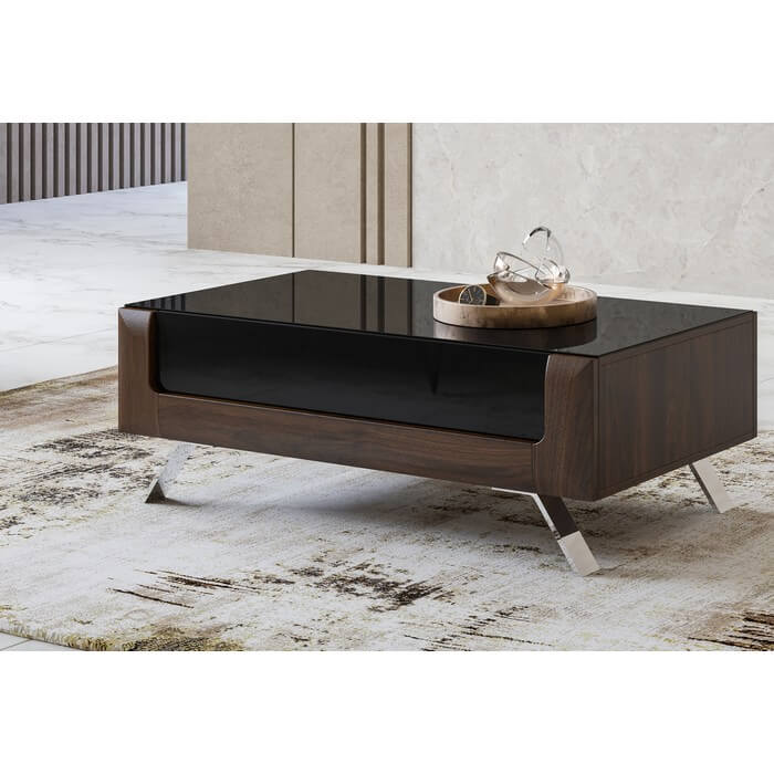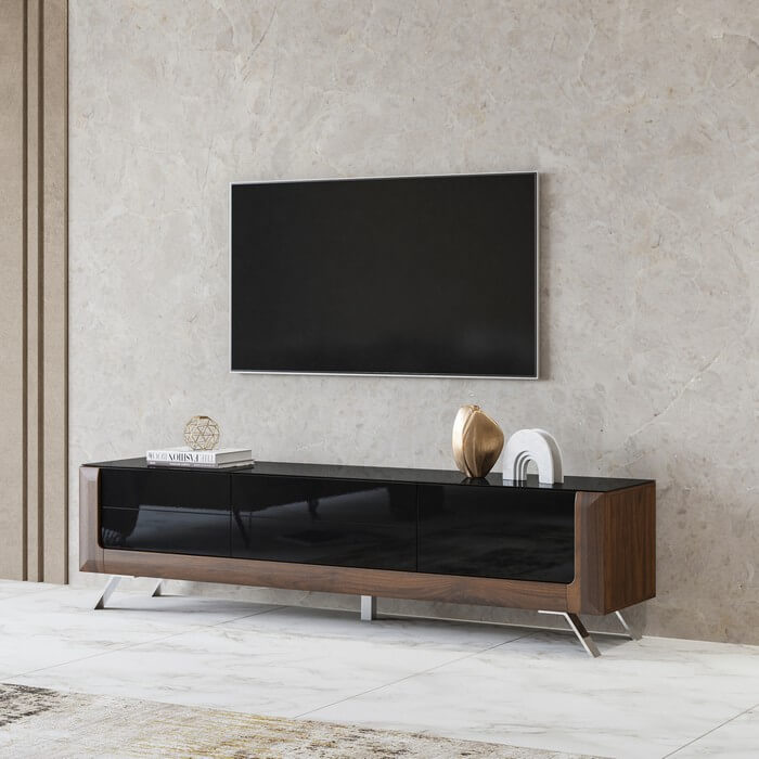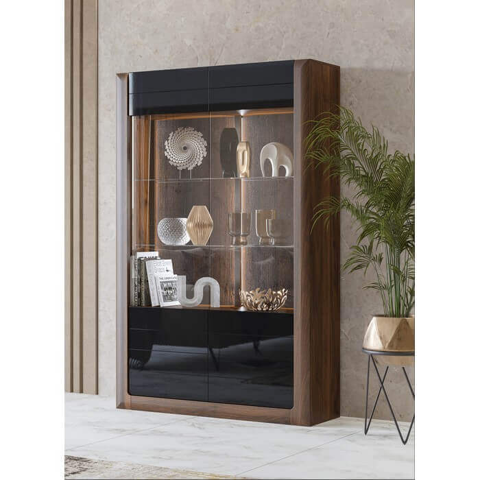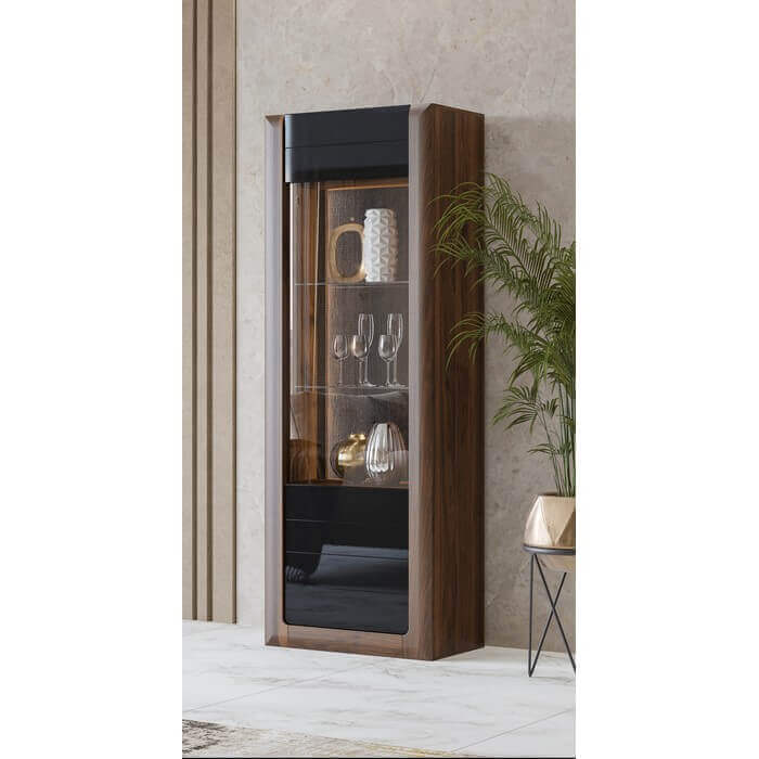 Fronty: płyta MDF wykończona folią membranową w kolorze orzech Columbia a korpus: orzech czarne szkło. Oświetlenie: dostępna opcja z oświetleniem LED. Prowadnice szuflad: z systemem cichego domyku. Hartowane szkło.