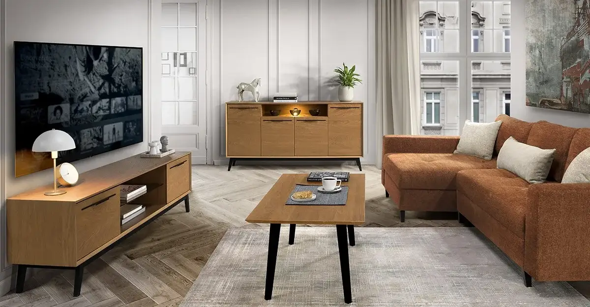 Naturalne drewno w odcieniu dębu rustical karmelowego pięknie komponuje się z subtelnymi metalowymi uchwytami, przyciągając uwagę i nadając wnętrzom elegancji. Przestronne wnętrza brył zapewniają funkcjonalne miejsce do przechowywania, dostępne w sposób wygodny i intuicyjny.
