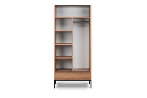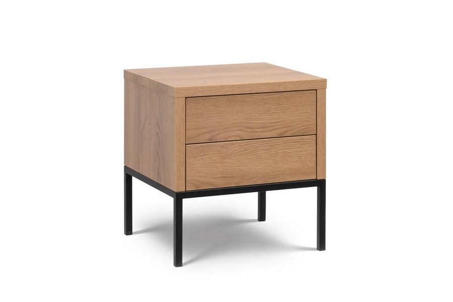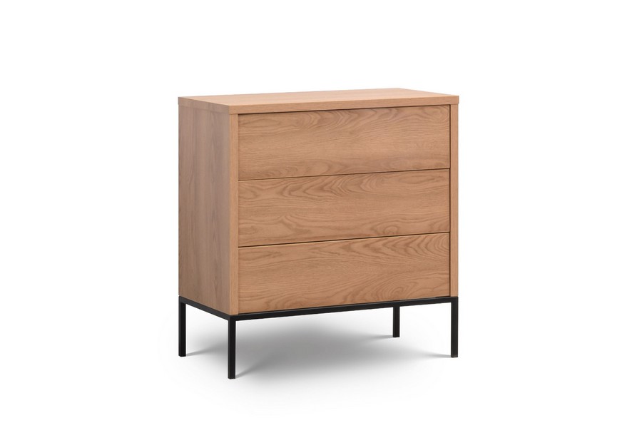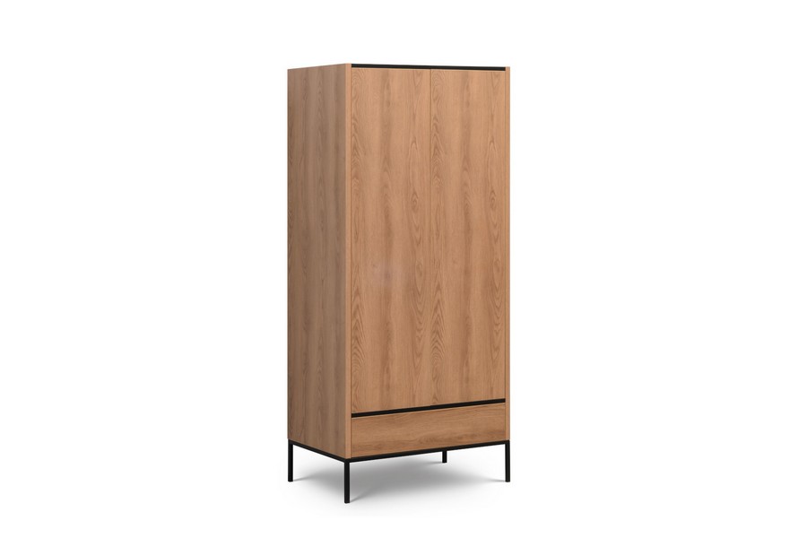 Dominującym elementem kolekcji są solidne, metalowe konstrukcje, pomalowane na czarny kolor proszkowy, które stanowią zarówno stabilną podstawę dla mebli, jak i dodają im nowoczesnego akcentu. Kolor okleiny na szafach harmonijnie współgra z tym motywem, tworząc spójną całość.