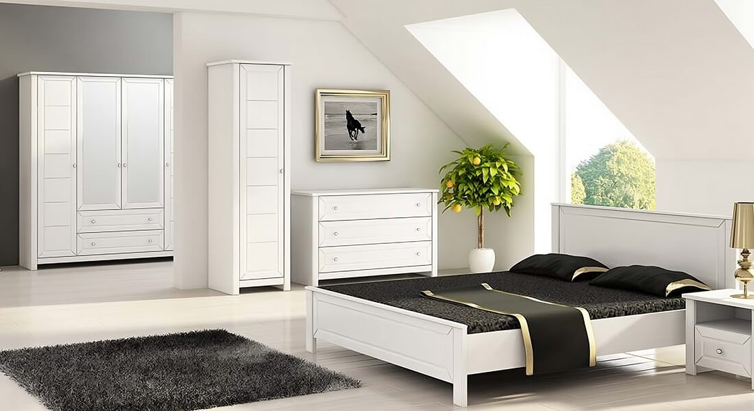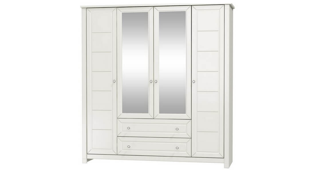 Szafa LS-4 to idealne rozwiązanie do przechowywania ubrań i akcesoriów. Z czterema drzwiami, w tym dwojgiem z lustrami, oraz dwiema szufladami, oferuje wystarczająco dużo miejsca na organizację garderoby. Wnętrze szafy wyposażone jest w półki na bieliznę oraz drążek, a szuflady umocowane są na prowadnicach rolkowych. Wykonana z wysokiej jakości materiałów, z metalowymi uchwytami w kolorze chromu z białym wypełnieniem, szafa LS-4 dodaje elegancji i funkcjonalności do sypialni.