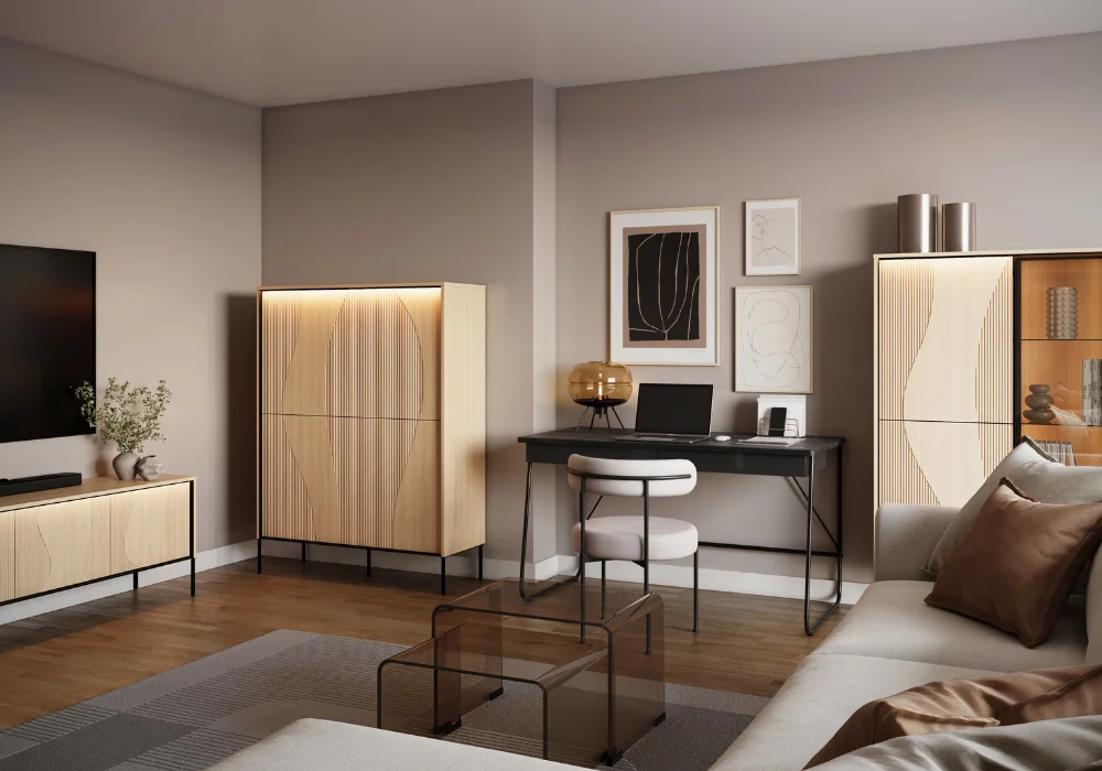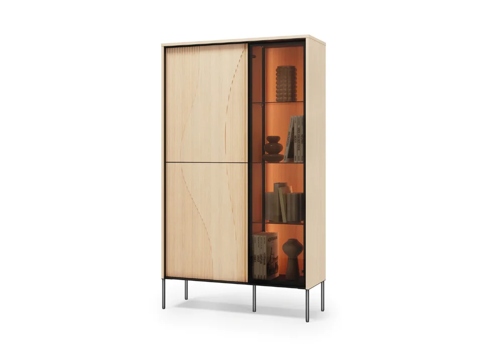 Każda bryła została zaprojektowana z dbałością o proporcje i codzienną wygodę użytkowania. Witryny i komody osadzone są na pięciu metalowych nogach, które stabilizują konstrukcję i dodają jej nowoczesnej lekkości. Wnętrza mebli zaplanowano w sposób intuicyjny, półki i przestrzenie do przechowywania ułatwiają organizację, bez konieczności kompromisów między estetyką a funkcją.