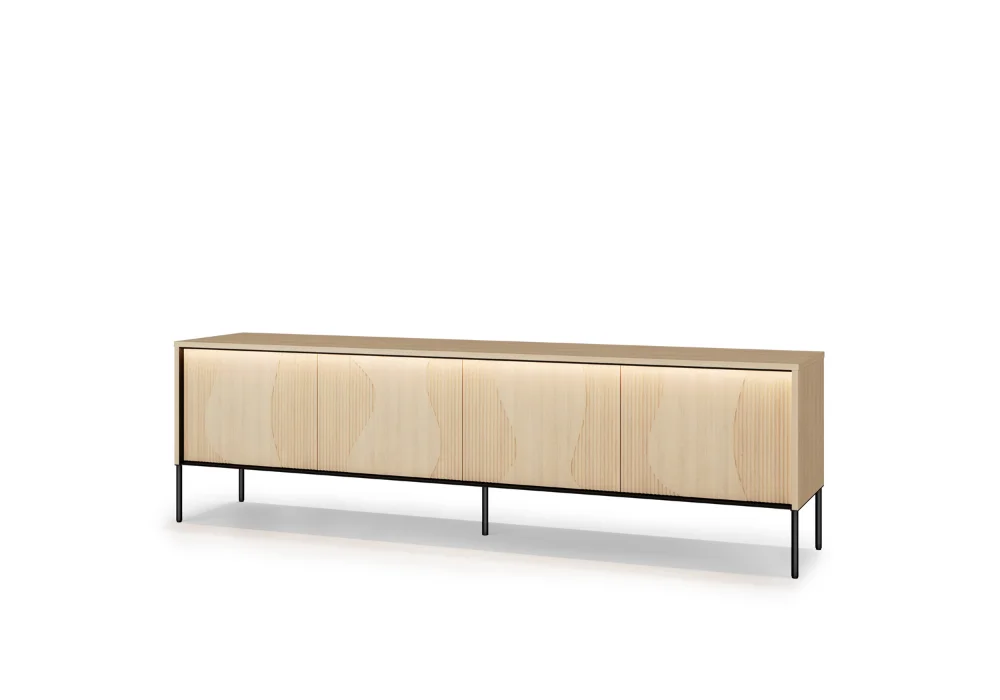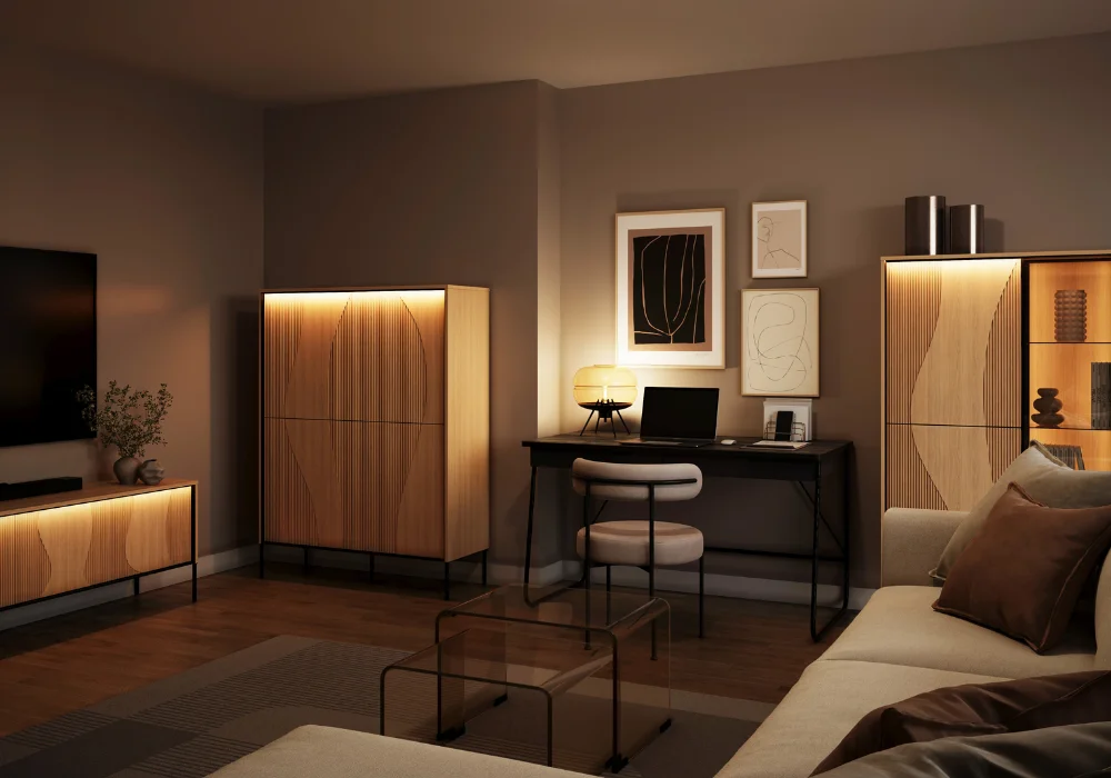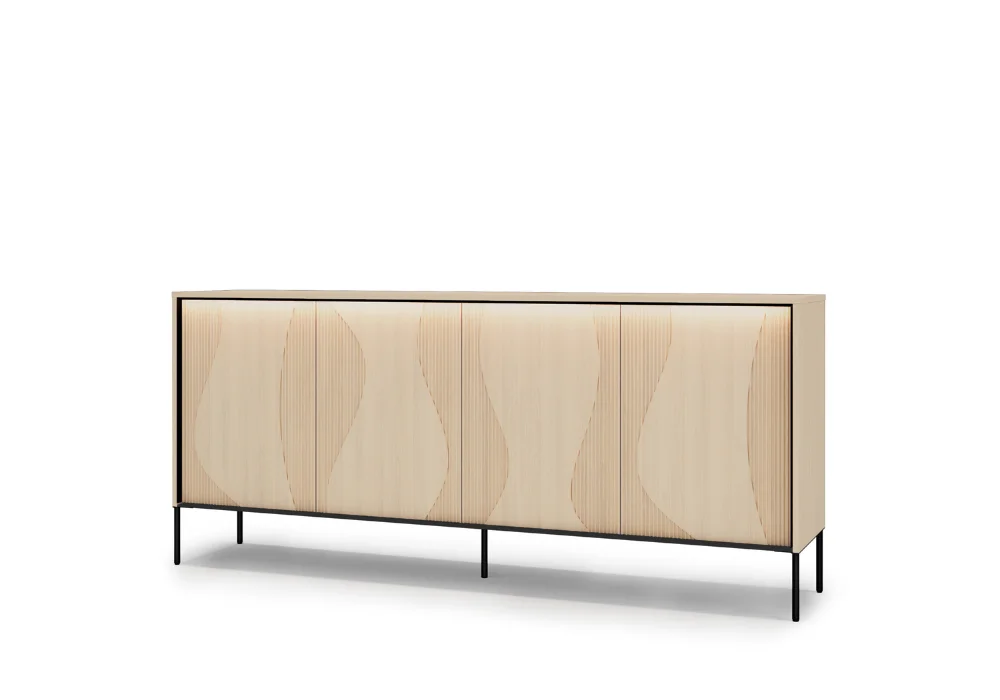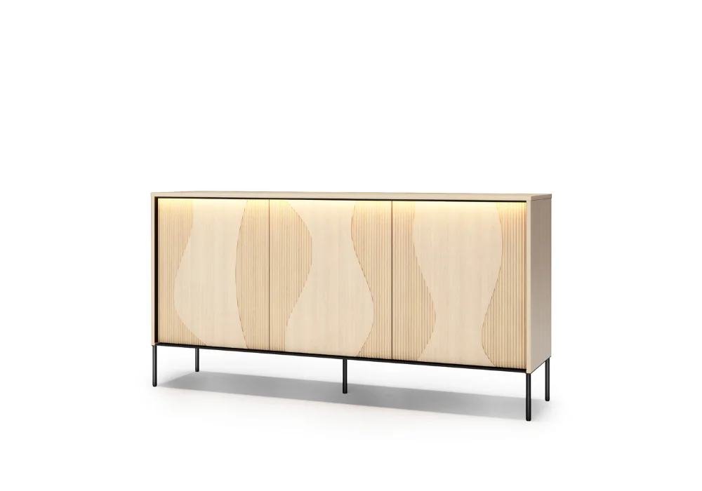 Flow daje również swobodę wyboru. Kolekcja obejmuje szeroki zestaw brył, pozwalających stworzyć spójną aranżację w salonie, sypialni czy jadalni. Model FW-02 oferuje dwa różne układy wzoru na froncie, w zależności od sposobu montażu drzwiczek, to detal, który pozwala subtelnie zmienić charakter mebla. Całość uzupełnia włącznik ze ściemniaczem, dzięki któremu łatwo dopasować intensywność światła do nastroju wnętrza.