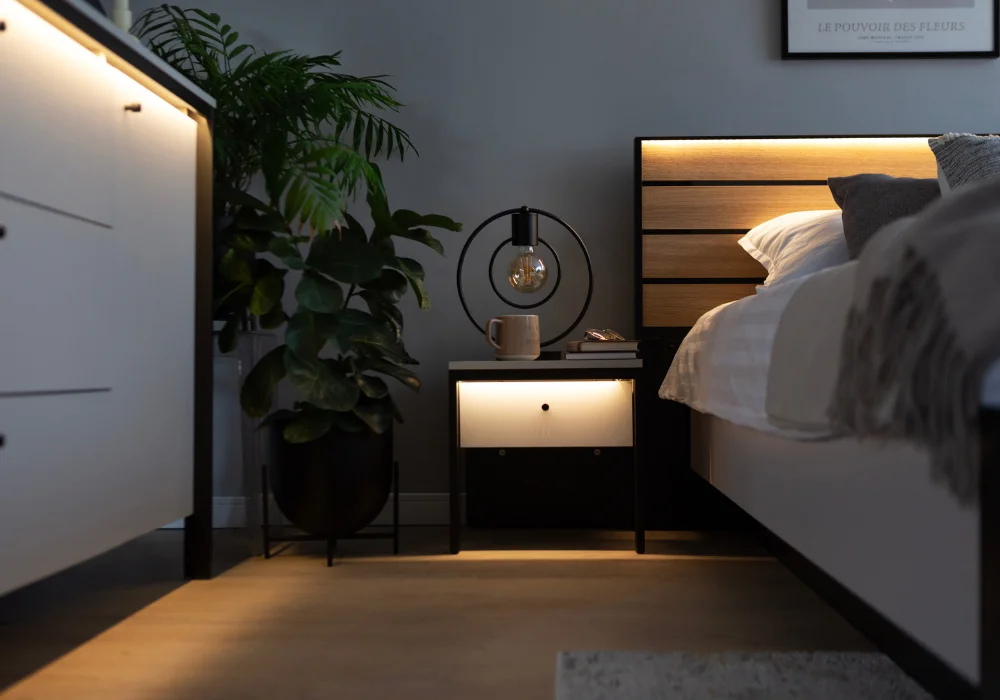 Wyjątkowym elementem kolekcji jest zewnętrzne oświetlenie LED, subtelnie podkreślające nieregularne linie frontów w witrynach, komodach i stoliku nocnym. To światło, które nie dominuje, lecz dopełnia aranżację. Witryna FW-01 została dodatkowo wyposażona w wewnętrzne oświetlenie LED, które w połączeniu ze szklanymi półkami delikatnie odsuniętymi od tylnej ścianki, tworzy idealną przestrzeń do ekspozycji dekoracji i ulubionych przedmiotów.