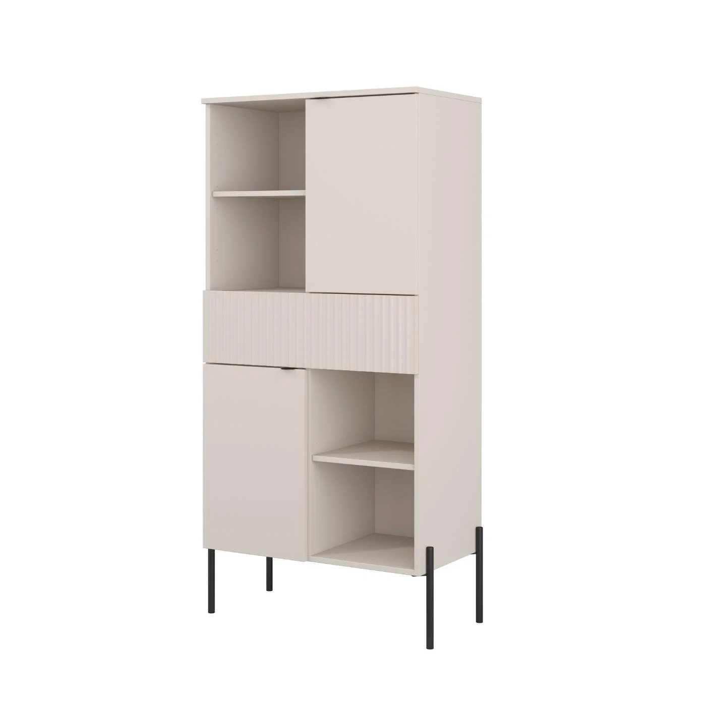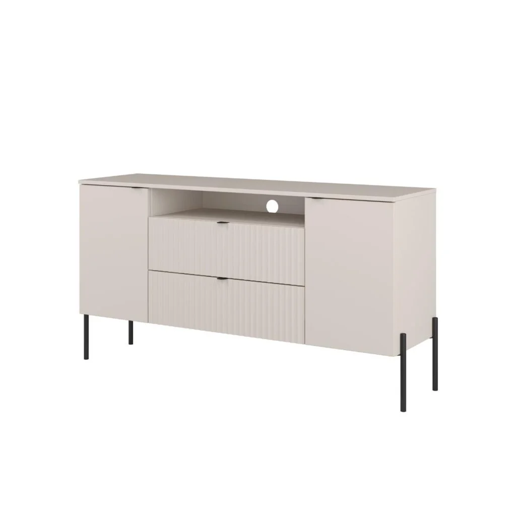 Charakterystycznym elementem kolekcji są smukłe, metalowe nóżki, które nadają bryłom lekkości i ułatwiają utrzymanie porządku pod meblami. Dzięki nim zabudowa wygląda lżej, a salon zyskuje bardziej otwarty, uporządkowany charakter. Układ szuflad i drzwiczek został zaplanowany tak, by przechowywanie było wygodne i intuicyjne.
