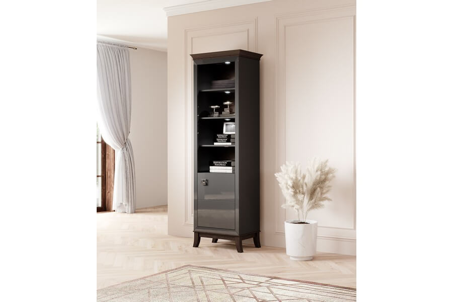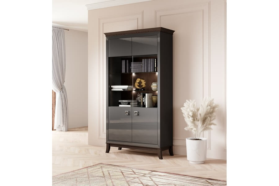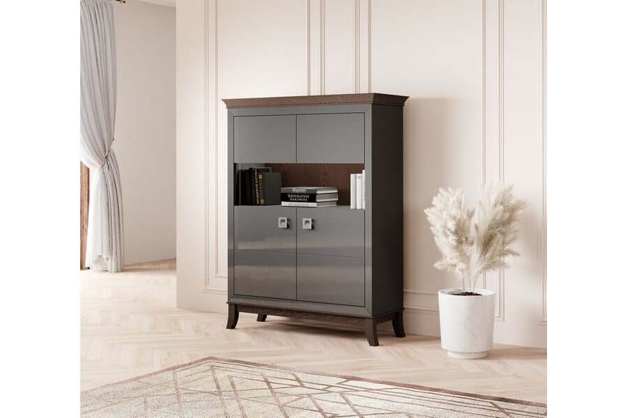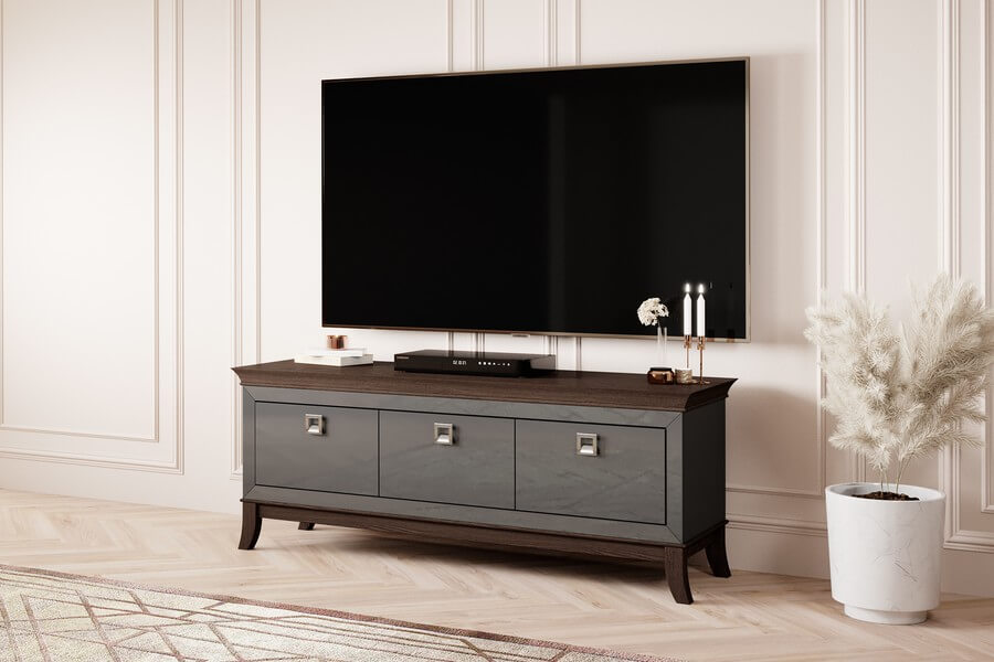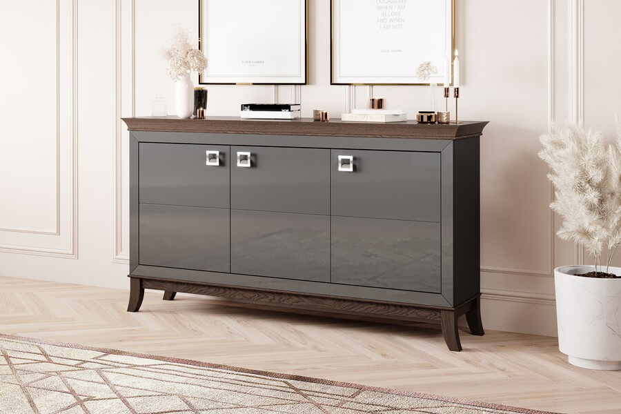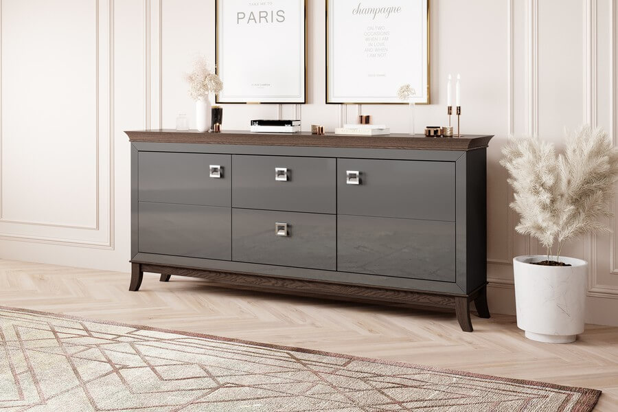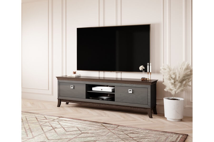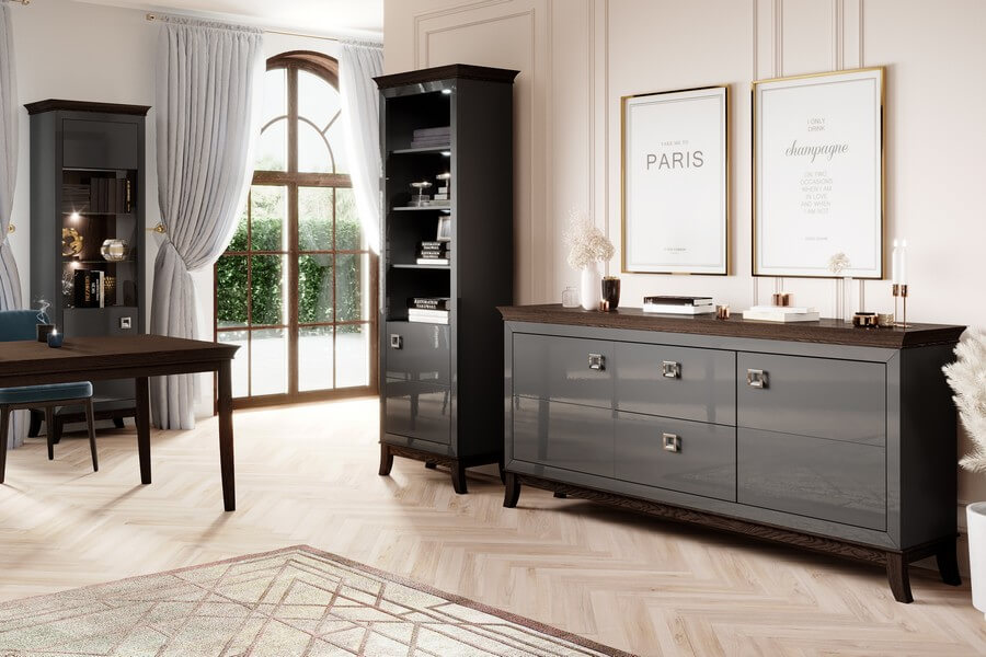 Centralnym elementem designu Tisaro są antracytowe fronty mebli, które nadają im luksusowy wygląd dzięki swojemu wysokiemu połyskowi. Te eleganckie, minimalistyczne detale doskonale kontrastują z ciepłym odcieniem dębu czekoladowego, użytego do produkcji korpusów mebli. To połączenie kolorów nadaje całej kolekcji unikalny i wyrafinowany charakter.