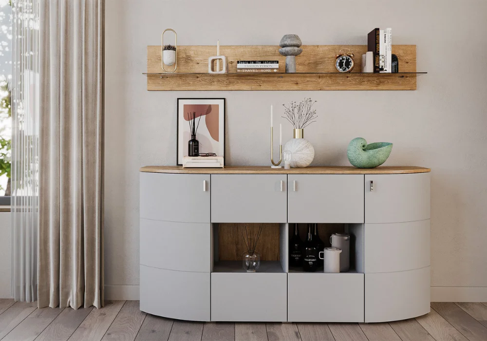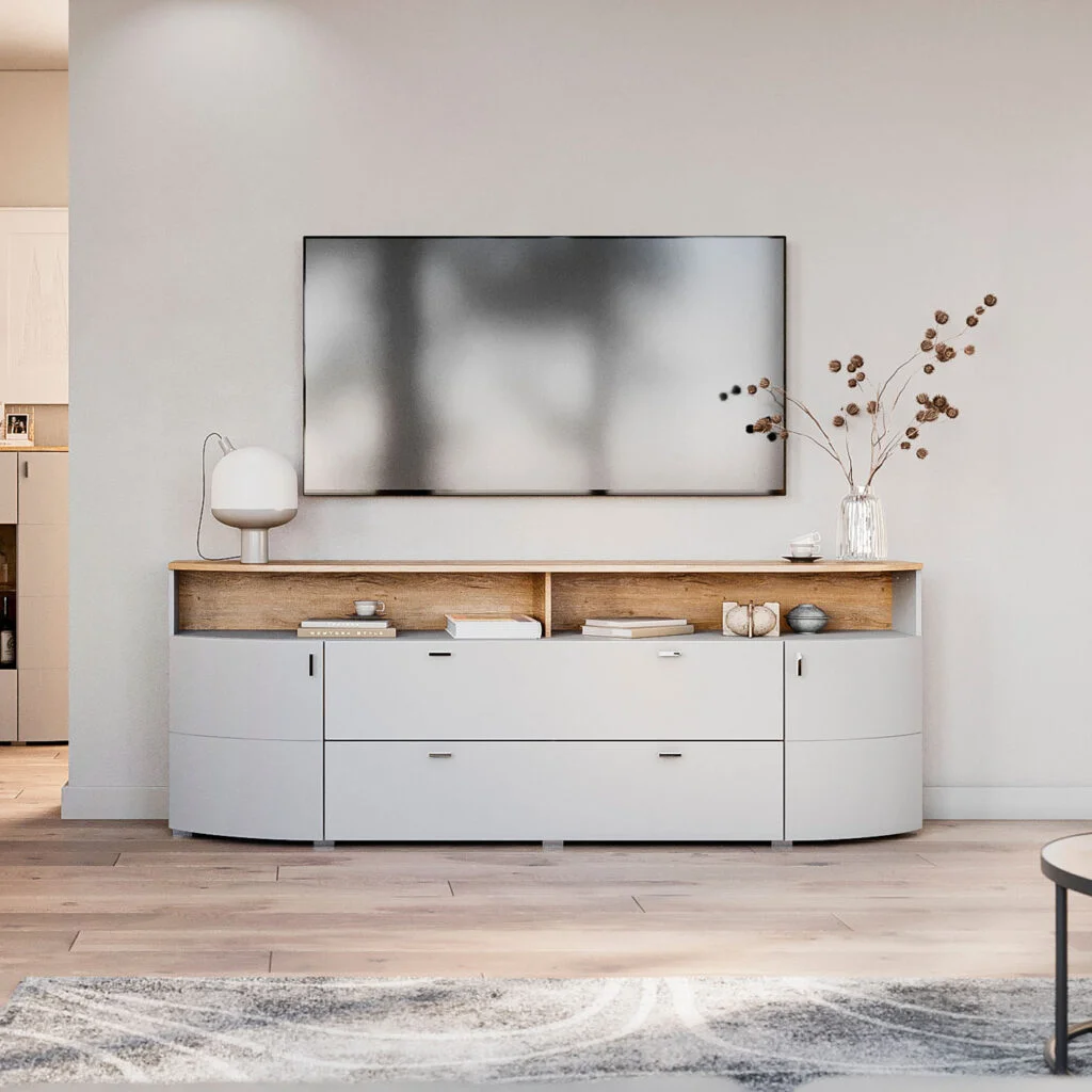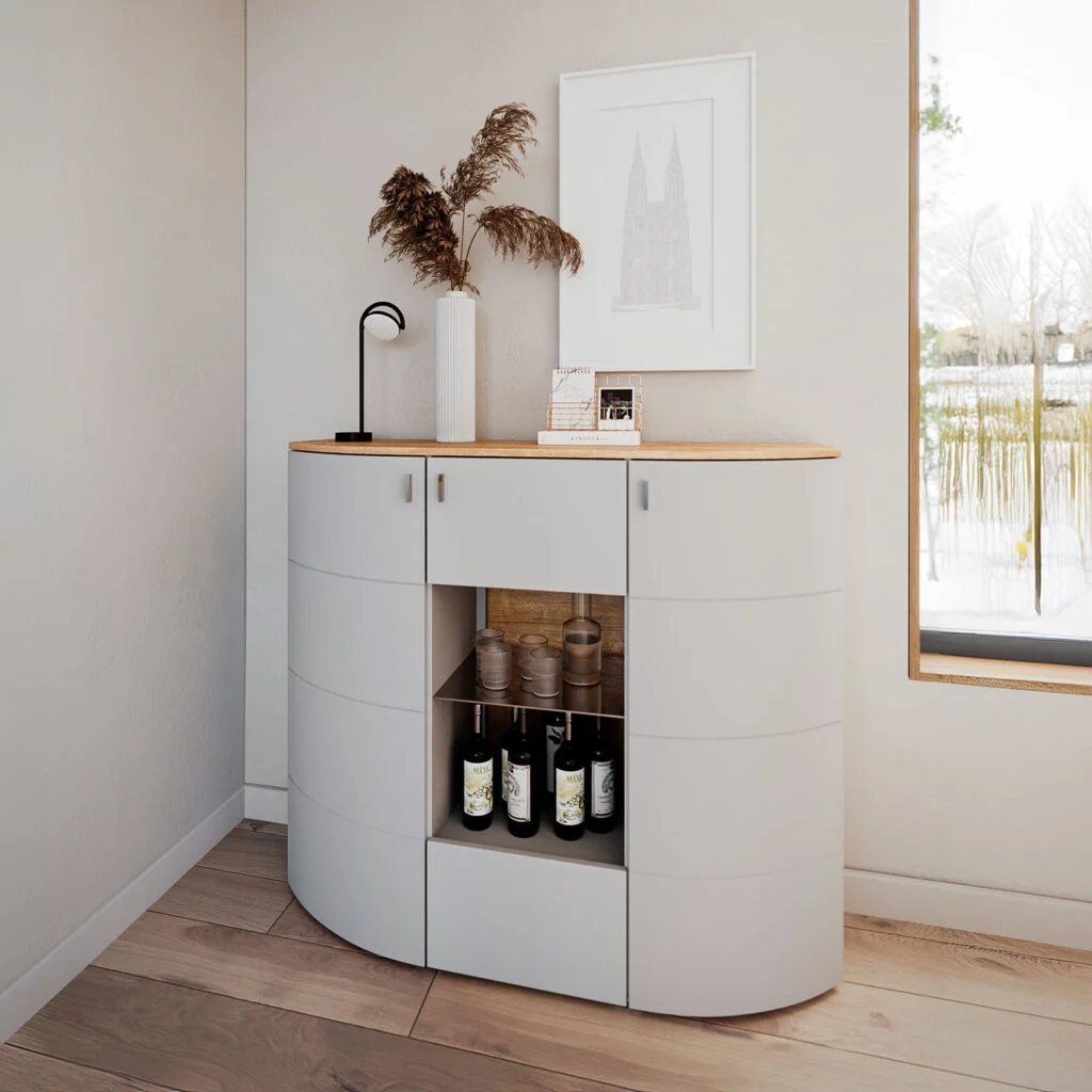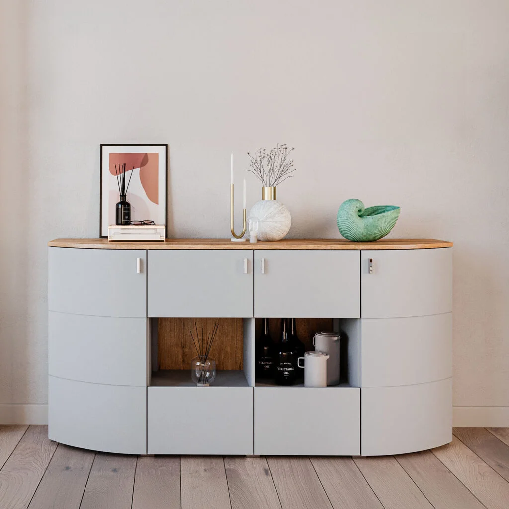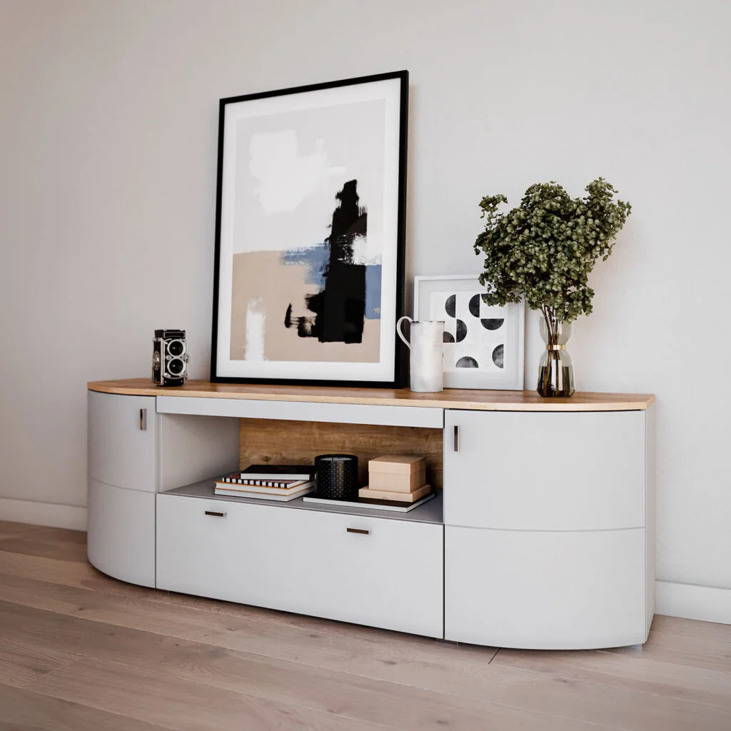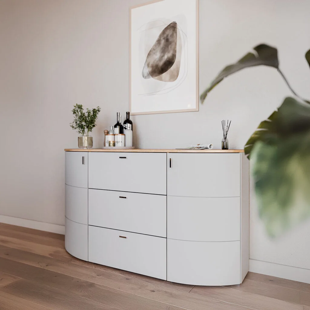 Delikatnie zaokrąglone fronty przełamują klasyczną geometrię brył, wprowadzając do wnętrza miękkość i wizualną lekkość.