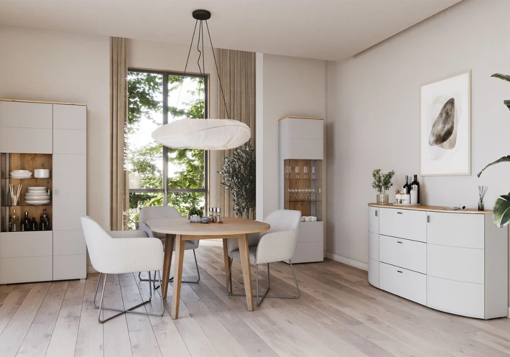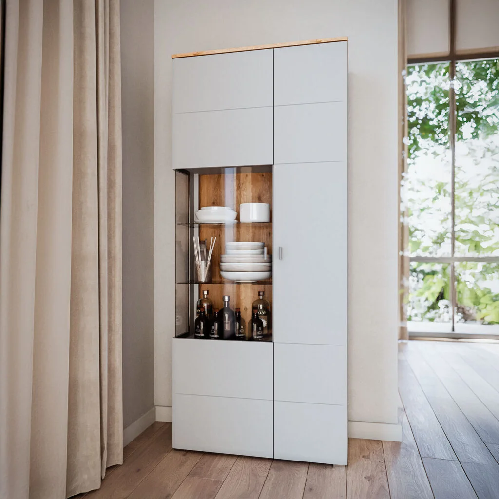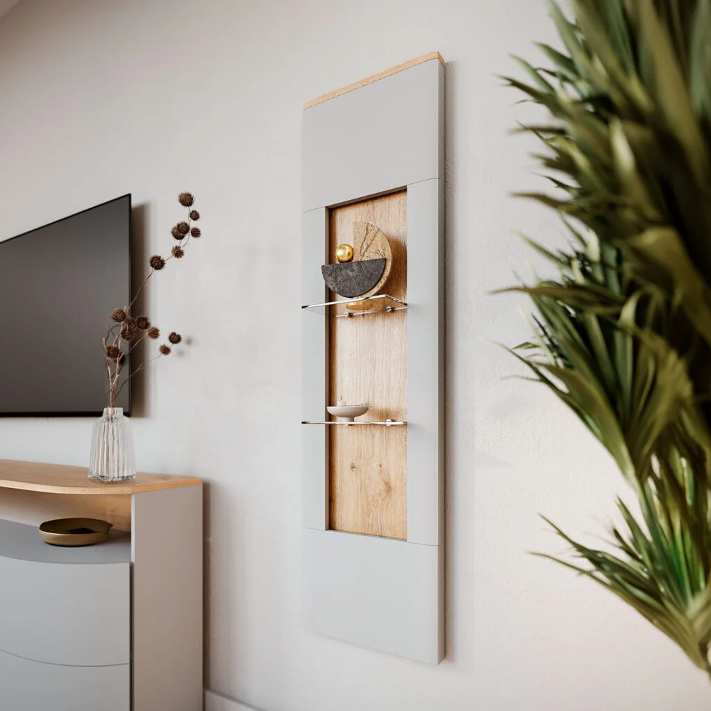 Kolekcja oferuje szeroki wybór brył, co pozwala stworzyć kompletną i funkcjonalną zabudowę salonu lub jadalni. Witryny z elementami szklanymi umożliwiają efektowną ekspozycję dekoracji, komody zapewniają wygodną przestrzeń do przechowywania, a szafki RTV oraz panele ścienne pomagają uporządkować strefę wypoczynku. Wszystkie elementy zostały zaprojektowane tak, aby tworzyły spójną całość, a jednocześnie dobrze funkcjonowały jako pojedyncze meble.