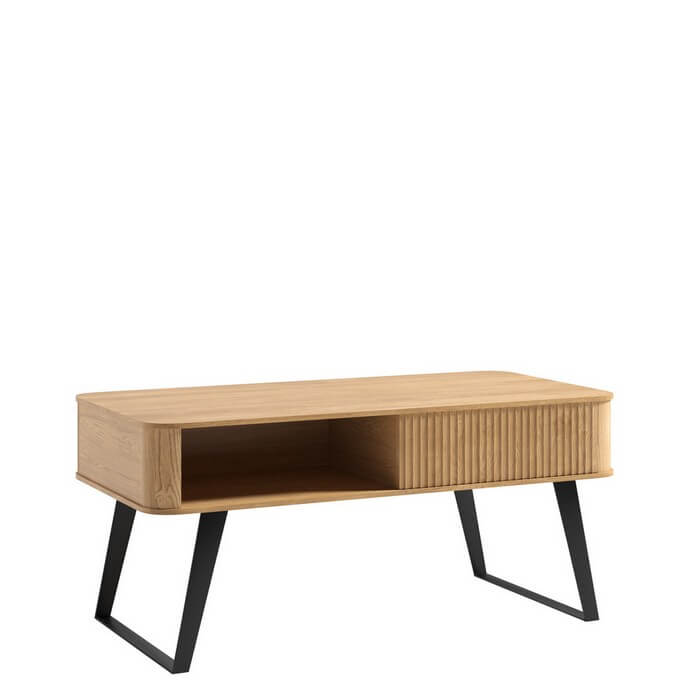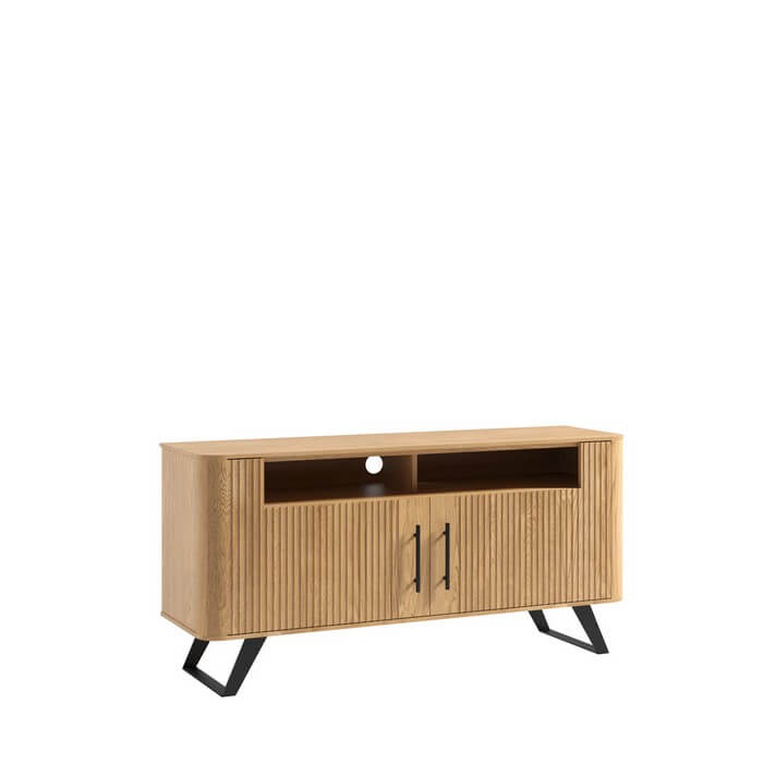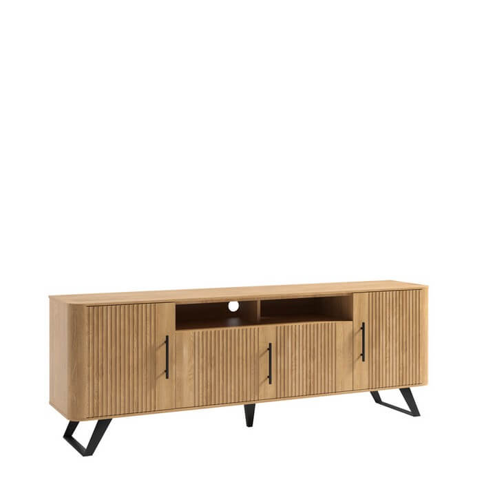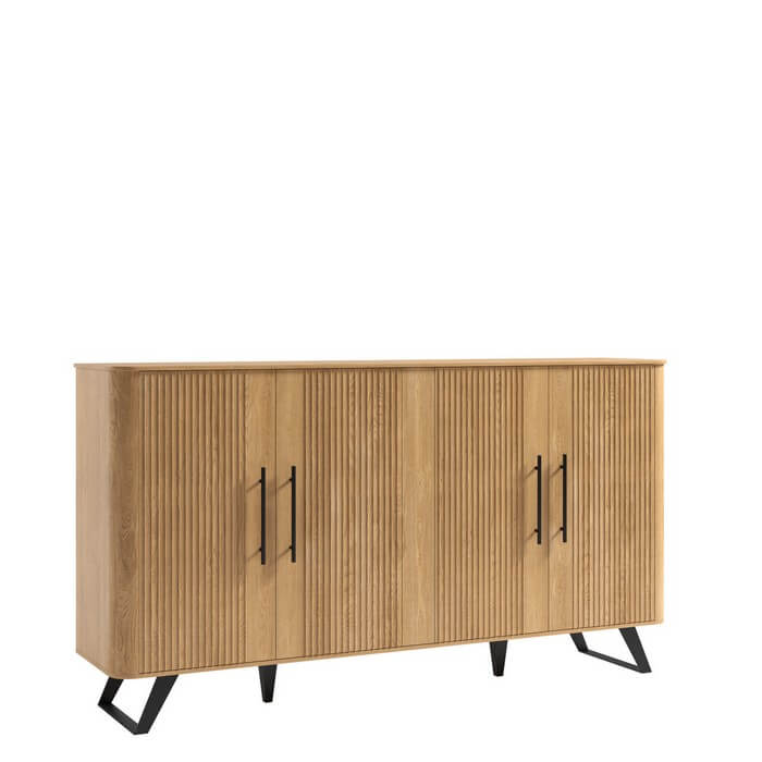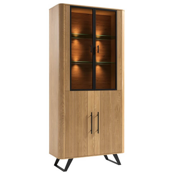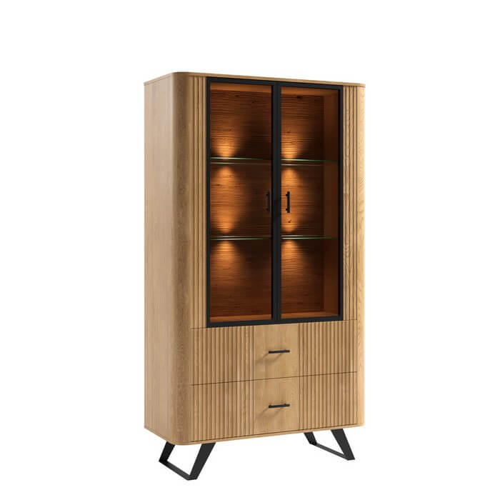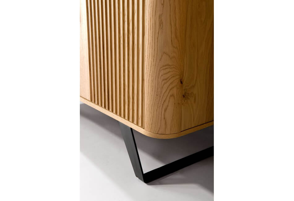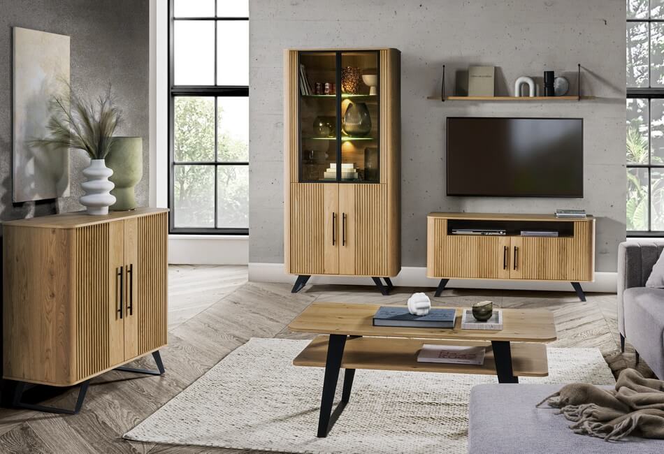 Kolekcja mebli Santos I to elegancki zestaw przeznaczony do salonu i jadalni, łączący nowoczesność z klasycznym rzemiosłem. Charakterystyczne dla tej kolekcji są fronty wykonane z naturalnej okleiny – forniru, o ryflowanej fakturze, które dodają meblom wyjątkowego charakteru i głębi.