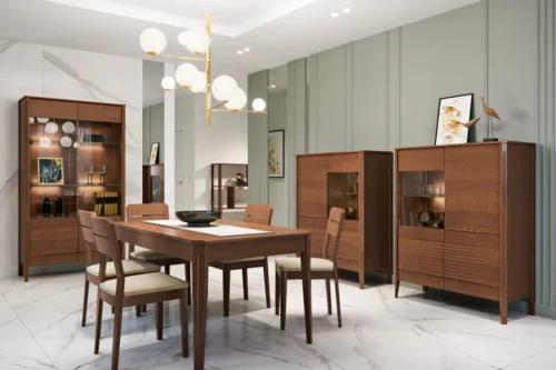 Szklane witryny z przyciemnianym szkłem Antisol eksponują zawartość w elegancki sposób, a wbudowane oświetlenie LED delikatnie rozprasza światło, wprowadzając przytulną atmosferę. Kolekcja obejmuje witryny, komody, szafki RTV, stół, stolik, regały oraz szafkę z barkiem, dzięki czemu pozwala na kompleksowe urządzenie salonu i jadalni.