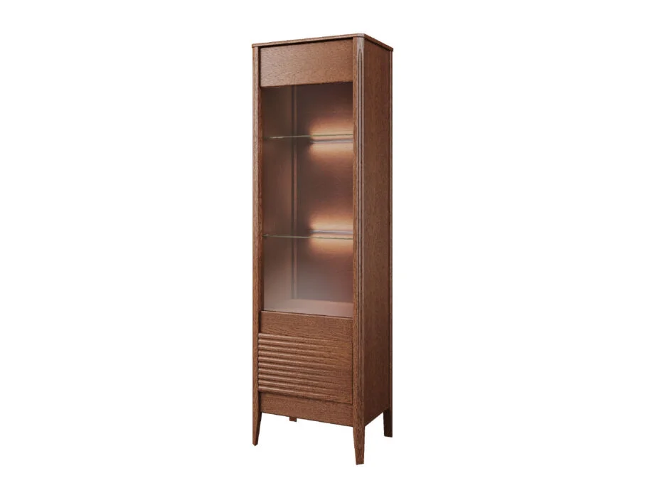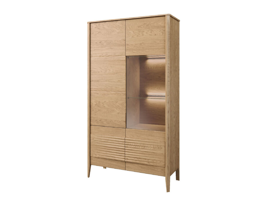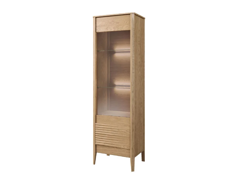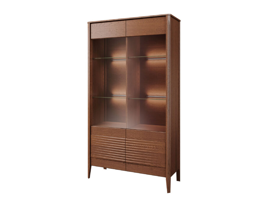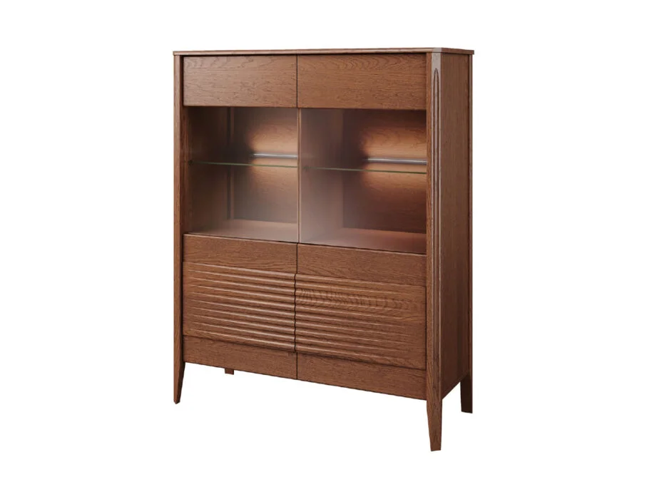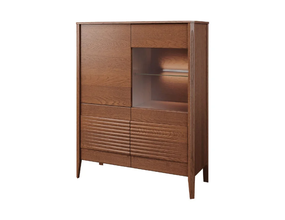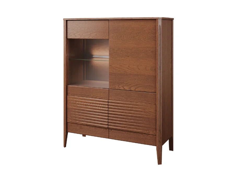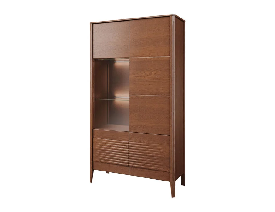 Szklane witryny z przyciemnianym szkłem Antisol eksponują zawartość w elegancki sposób, a wbudowane oświetlenie LED delikatnie rozprasza światło, wprowadzając przytulną atmosferę. Kolekcja obejmuje witryny, komody, szafki RTV, stół, stolik, regały oraz szafkę z barkiem, dzięki czemu pozwala na kompleksowe urządzenie salonu i jadalni.