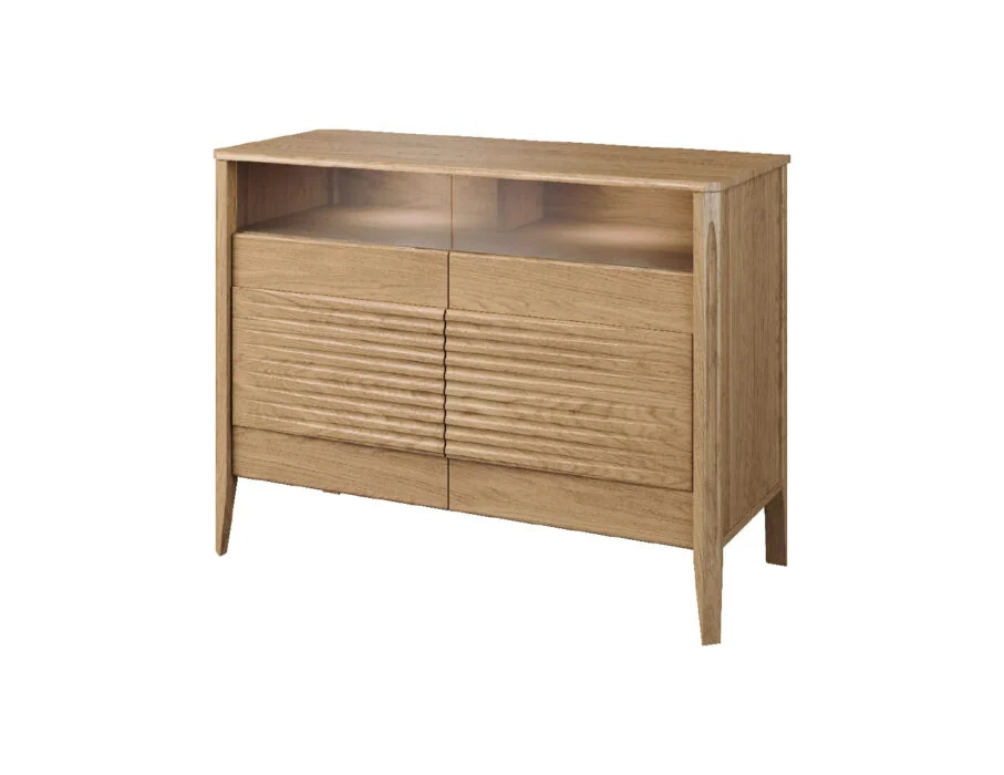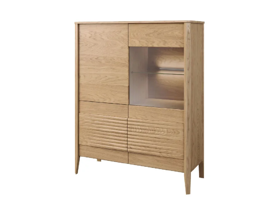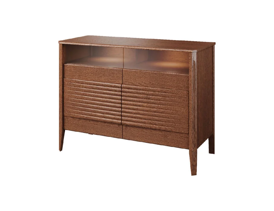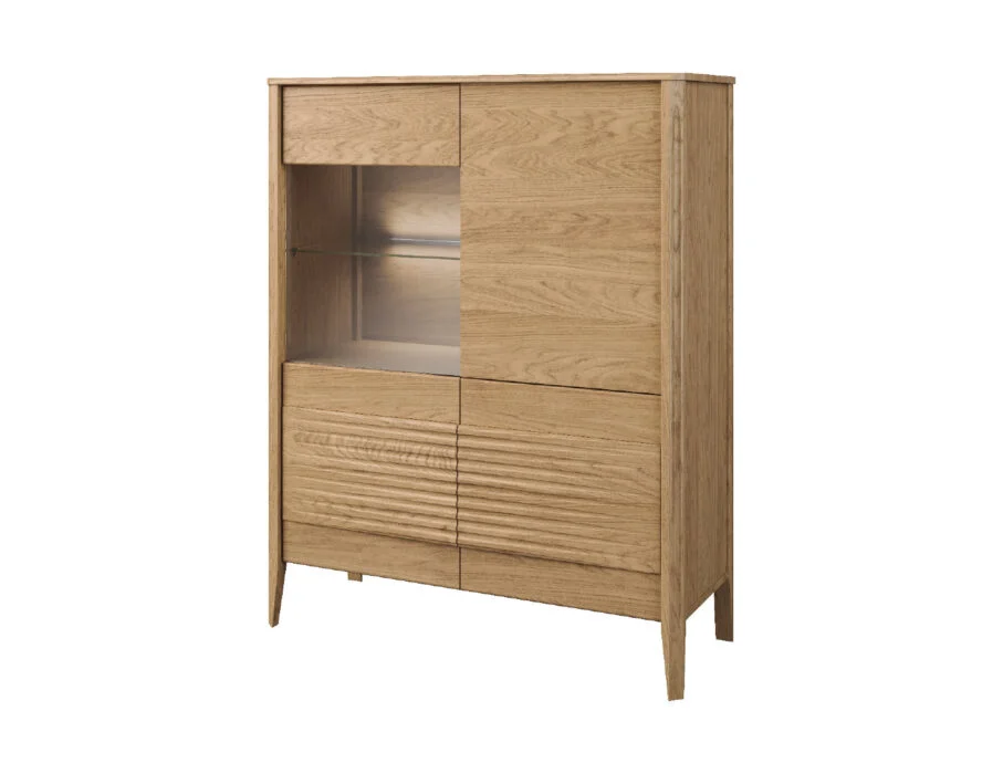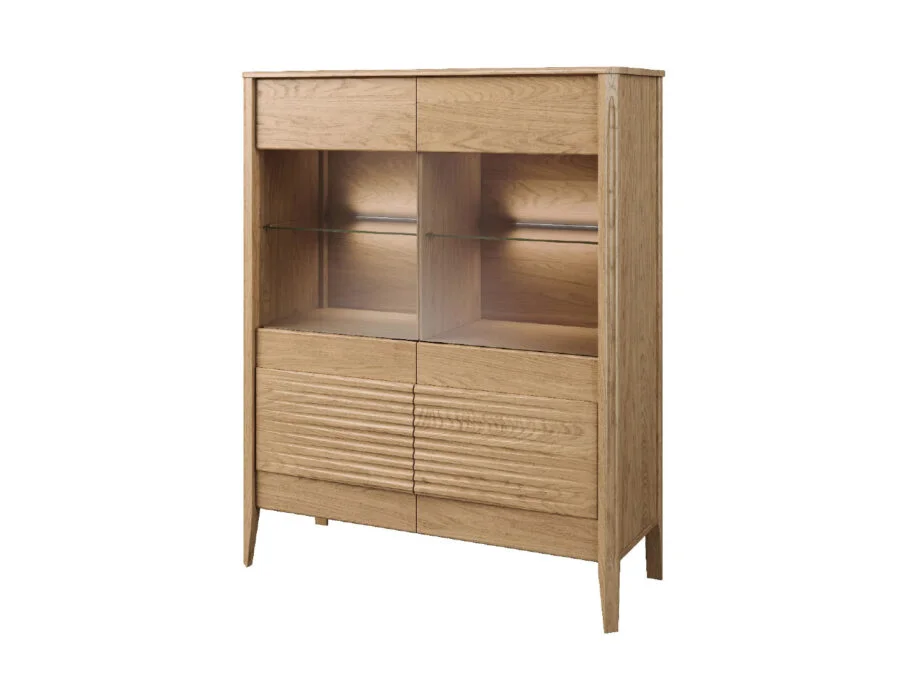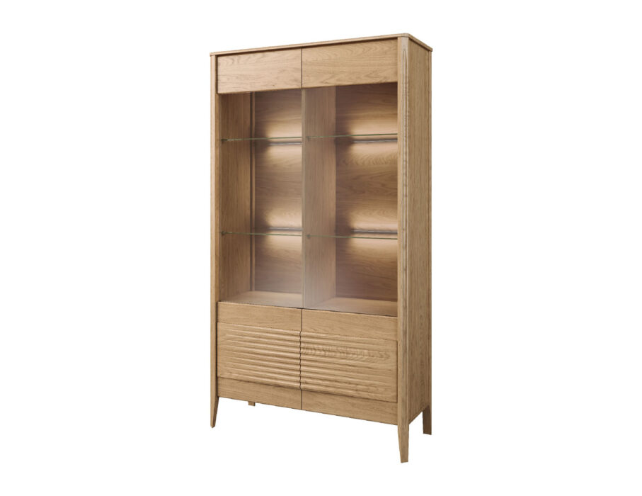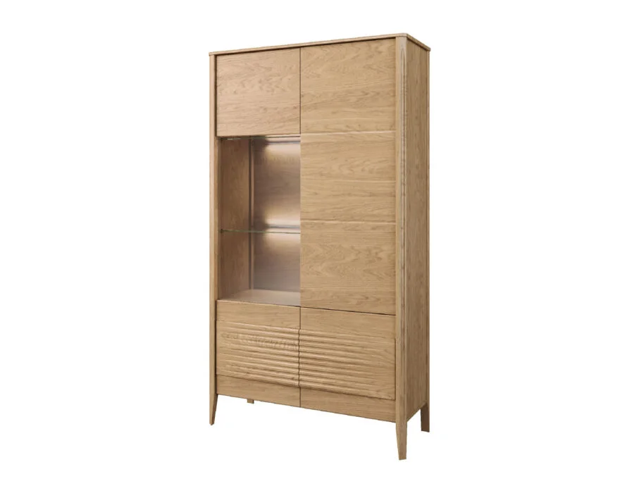 Szklane witryny z przyciemnianym szkłem Antisol eksponują zawartość w elegancki sposób, a wbudowane oświetlenie LED delikatnie rozprasza światło, wprowadzając przytulną atmosferę. Kolekcja obejmuje witryny, komody, szafki RTV, stół, stolik, regały oraz szafkę z barkiem, dzięki czemu pozwala na kompleksowe urządzenie salonu i jadalni.