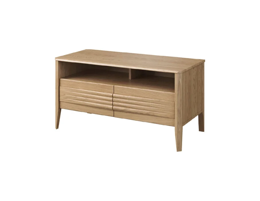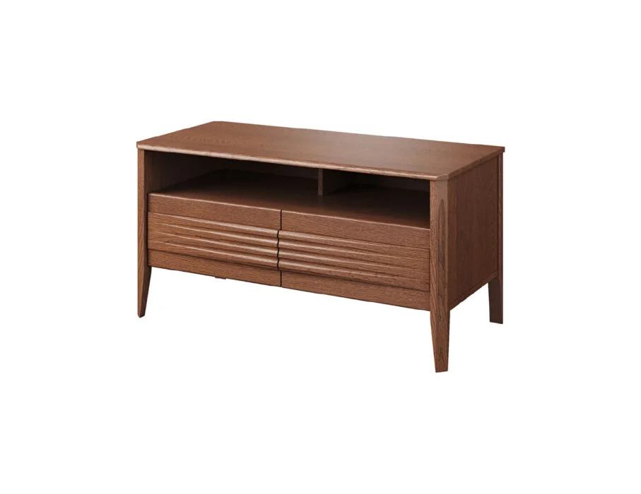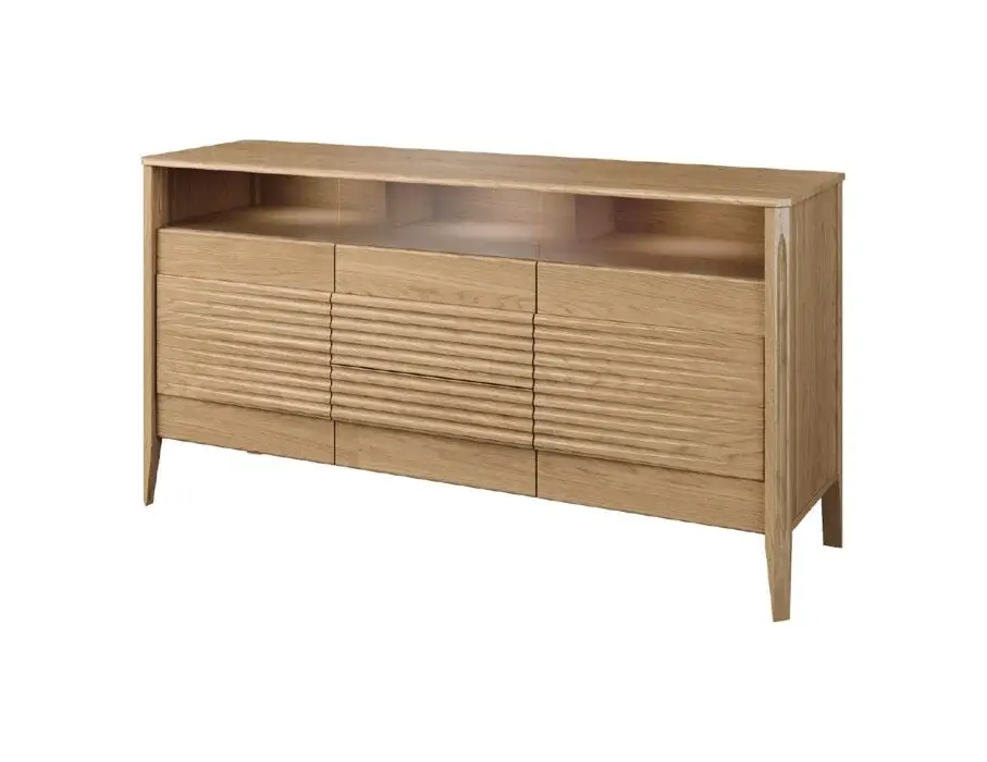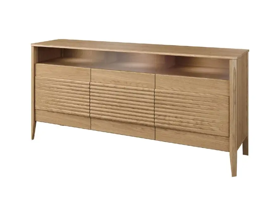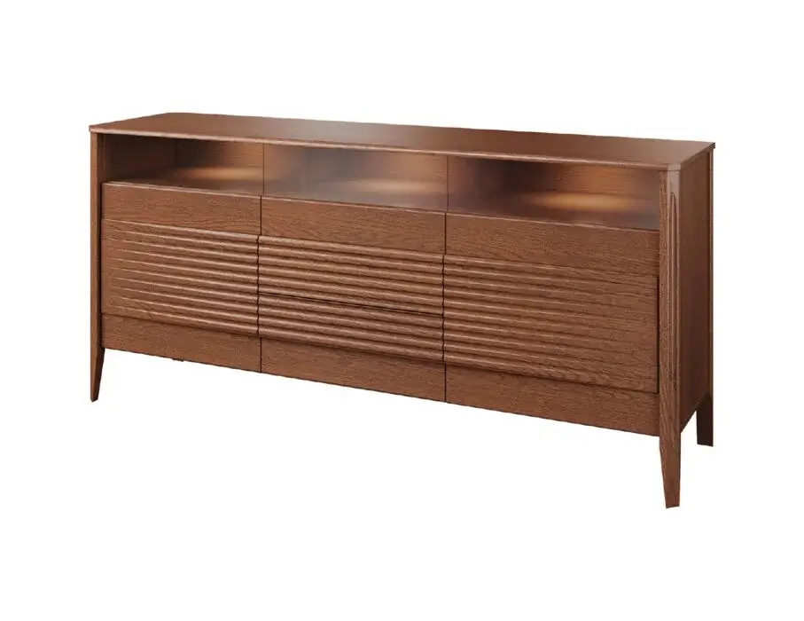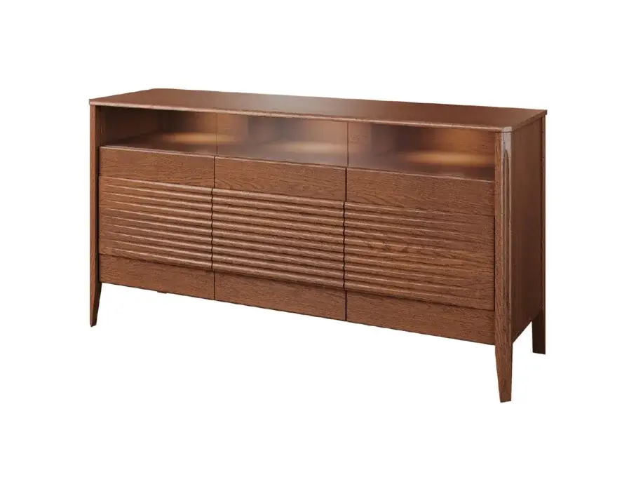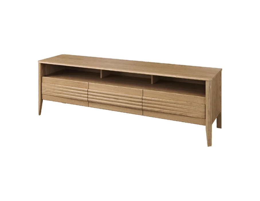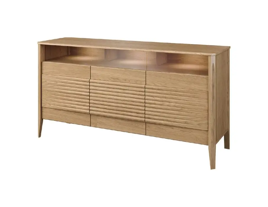 Szklane witryny z przyciemnianym szkłem Antisol eksponują zawartość w elegancki sposób, a wbudowane oświetlenie LED delikatnie rozprasza światło, wprowadzając przytulną atmosferę. Kolekcja obejmuje witryny, komody, szafki RTV, stół, stolik, regały oraz szafkę z barkiem, dzięki czemu pozwala na kompleksowe urządzenie salonu i jadalni.