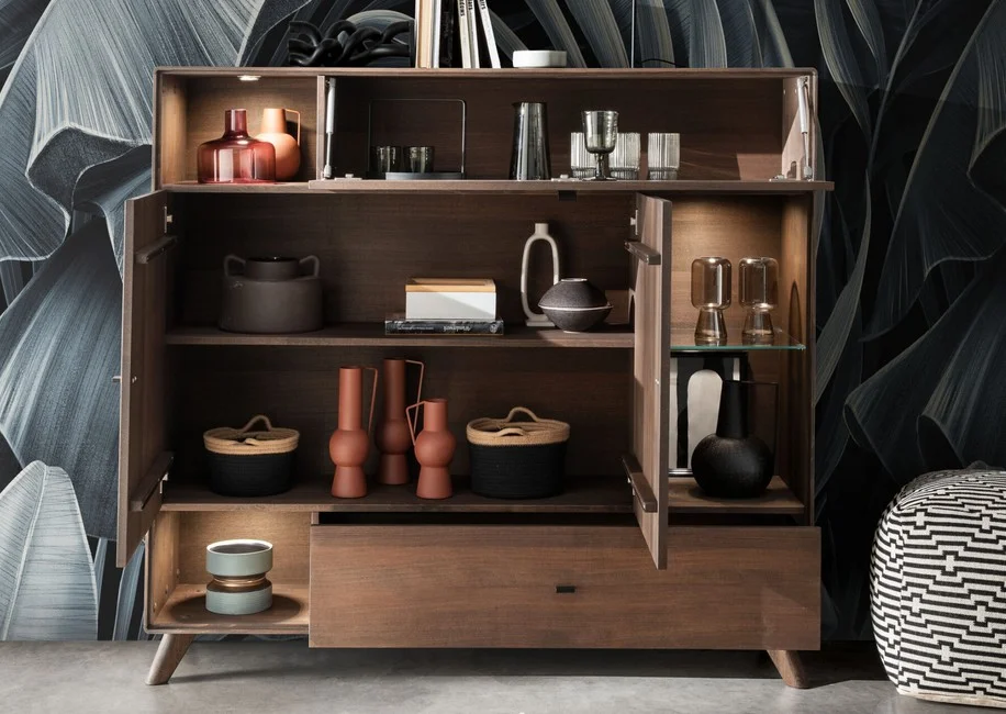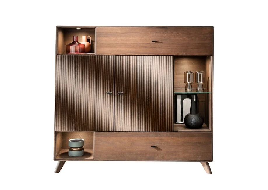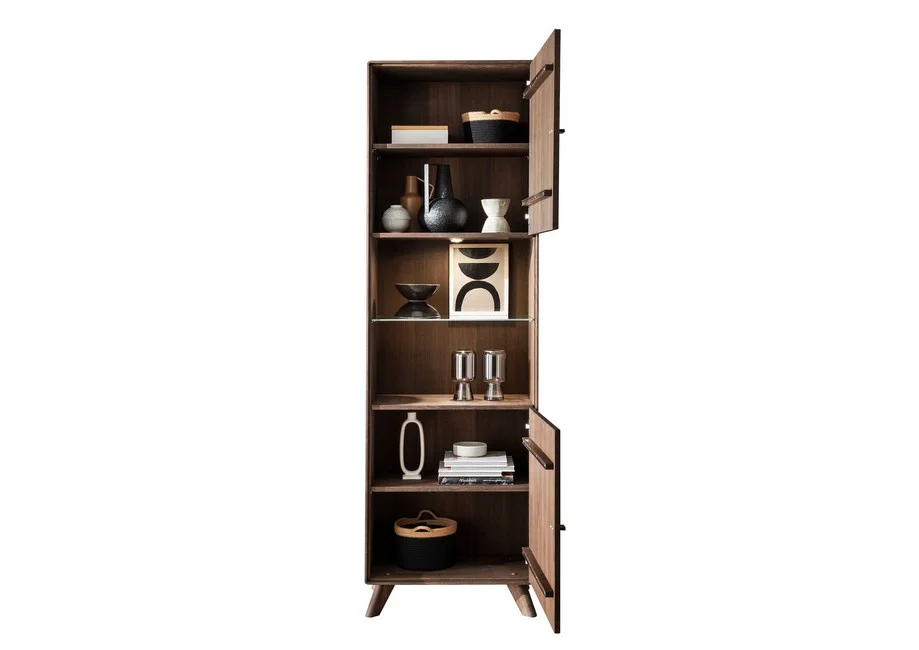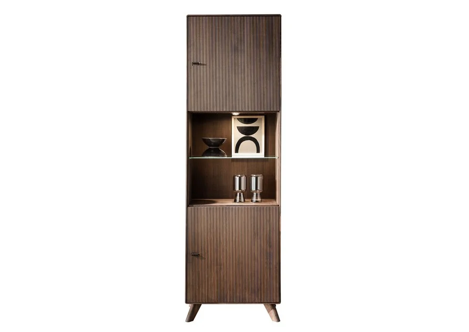 Witryna I WZ-0624 to elegancki mebel z litego drewna bukowego, osadzony na subtelnych, minimalistycznych nóżkach. Jej ciemne wykończenie w odcieniu tytoniowym idealnie wpisuje się w nowoczesne aranżacje, tworząc efektowny kontrast z jasnymi wnętrzami. Witryna oferuje przestrzeń do eksponowania dekoracji, a ryflowane fronty nadają jej unikalny i oryginalny charakter, który przyciąga uwagę.